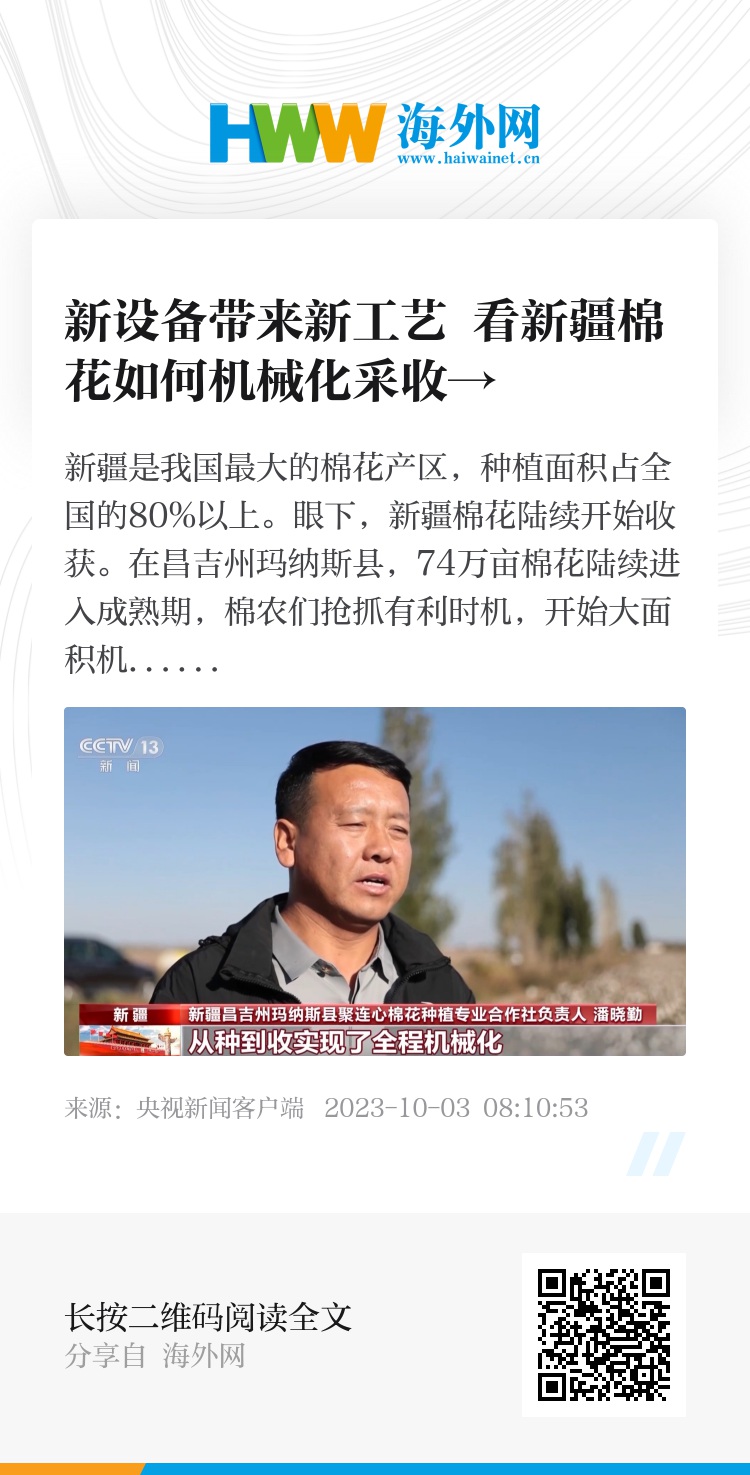 新疆昌吉州玛纳斯县聚连心棉花种植专业合作社负责人 潘晓勤:现在我们种棉花从种到收实现了全程机械化。通过数字化农业实现了水肥一体化,通过新的技术应用,我们棉花品质提高了,产量也得到了一定提升,收入也好了