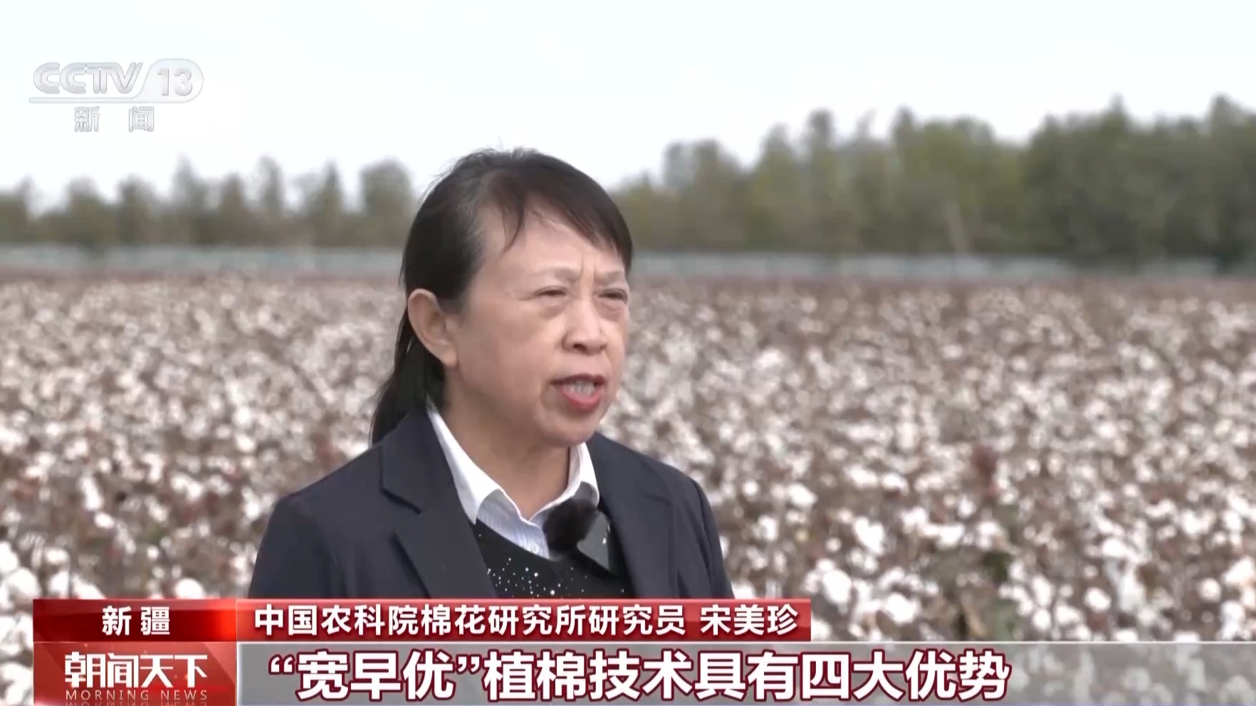 中国农科院棉花研究所研究员 宋美珍:“宽早优”植棉技术具有四大优势,即增温增光、减药减肥减人工、绿色提质和增产增效。通过扩行距、降密度、壮植株、增株高,棉花单产可提高10%以上,原棉品质提高1个档级。