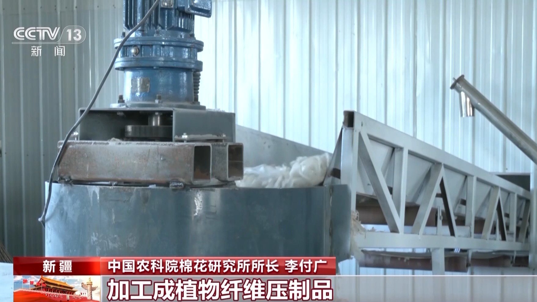 中国农科院棉花研究所所长 李付广:同时,还可以将掺杂在废旧地膜中的秸秆类物质通过自动化生产线加工成植物纤维压制品,进一步提高了农业废弃物资源化利用水平。目前,第一条生产线每年可处理约50万亩的回收残膜。