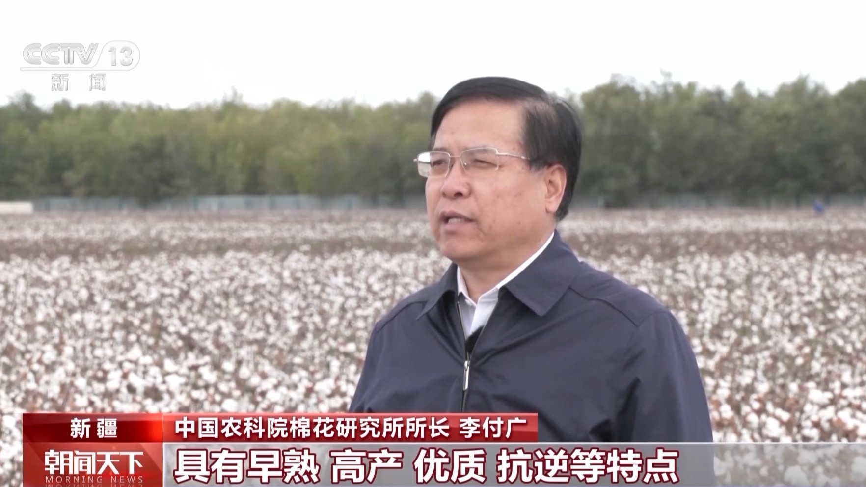 中国农科院棉花研究所所长 李付广:早熟棉花新品种中棉113,综合性状优良,具有早熟、高产、优质、抗逆等特点,配合“宽早优”种植模式在新疆大面积推广种植,确保新疆地区高品质棉花稳定供应。