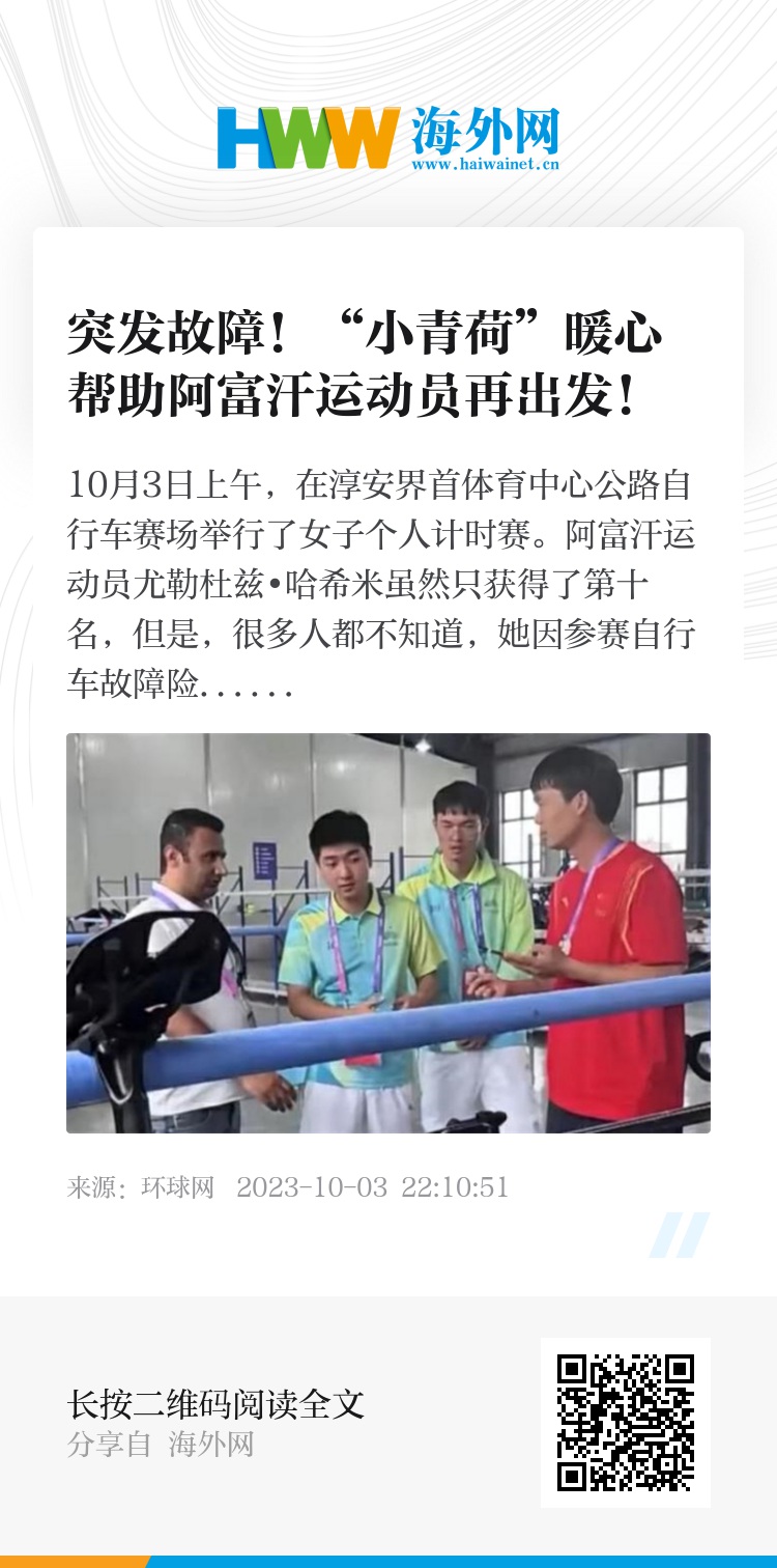 “得知我将为杭州第19届亚运会的自行车比赛服务时,我就每天有意识学习一些自行车相关的英文术语,了解了各类自行车构造,特别是零部件方面的知识,没想到在这次的赛会服务中都派上了用场。”姜苏晗说,“利用修理车辆的间隙,我还给阿富汗运动员们科普了中国的交通法和注意事项,帮助他们适应国内的道路情况。现在我们成为了朋友,每天他们骑行路过仓储中心都会停下来和我聊一下训练的进展和在千岛湖新的发现。”