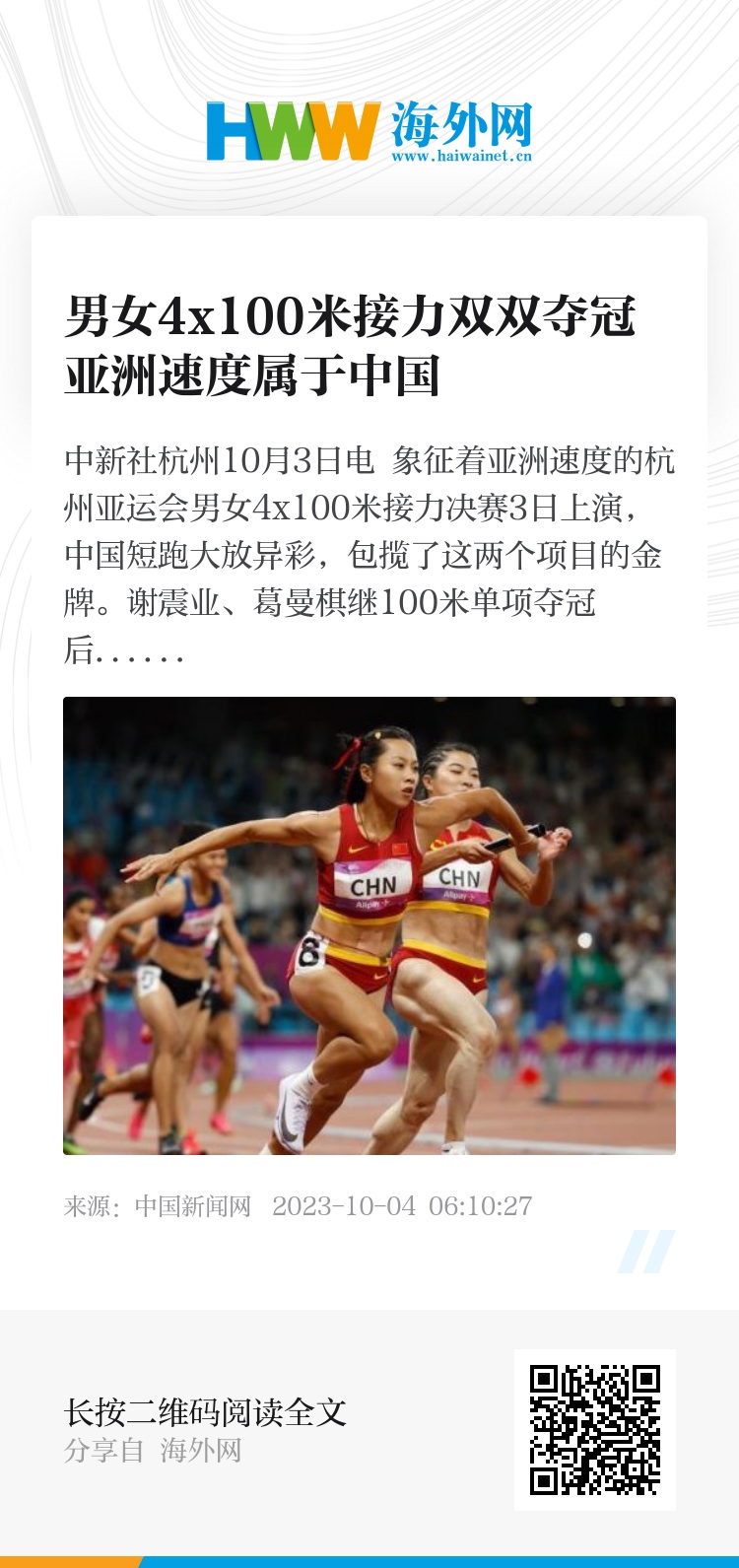 中新社杭州10月3日电 象征着亚洲速度的杭州亚运会男女4x100米接力决赛3日上演,中国短跑大放异彩,包揽了这两个项目的金牌。谢震业、葛曼棋继100米单项夺冠后再添一金,成为亚运会短跑“双冠王”。