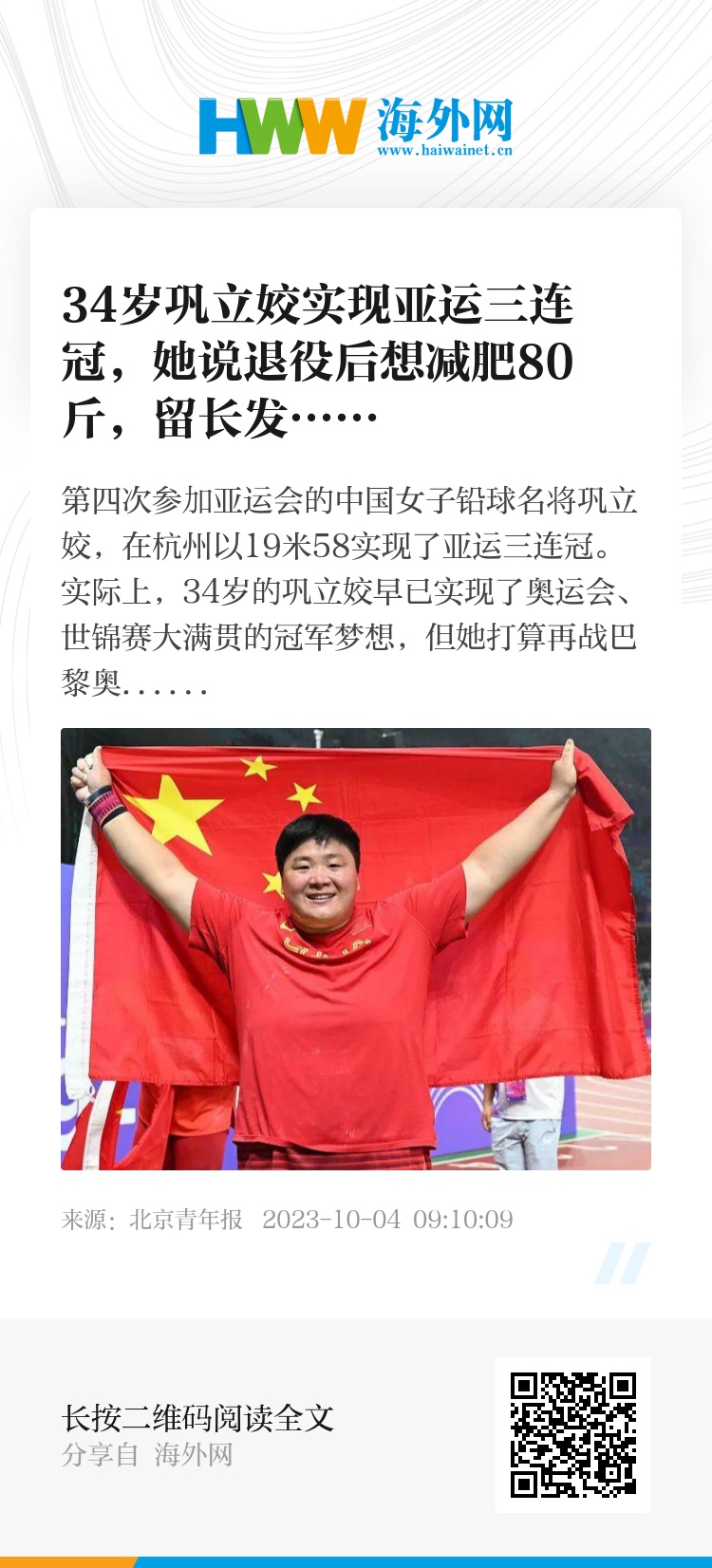 第四次参加亚运会的中国女子铅球名将巩立姣,在杭州以19米58实现了亚运三连冠。