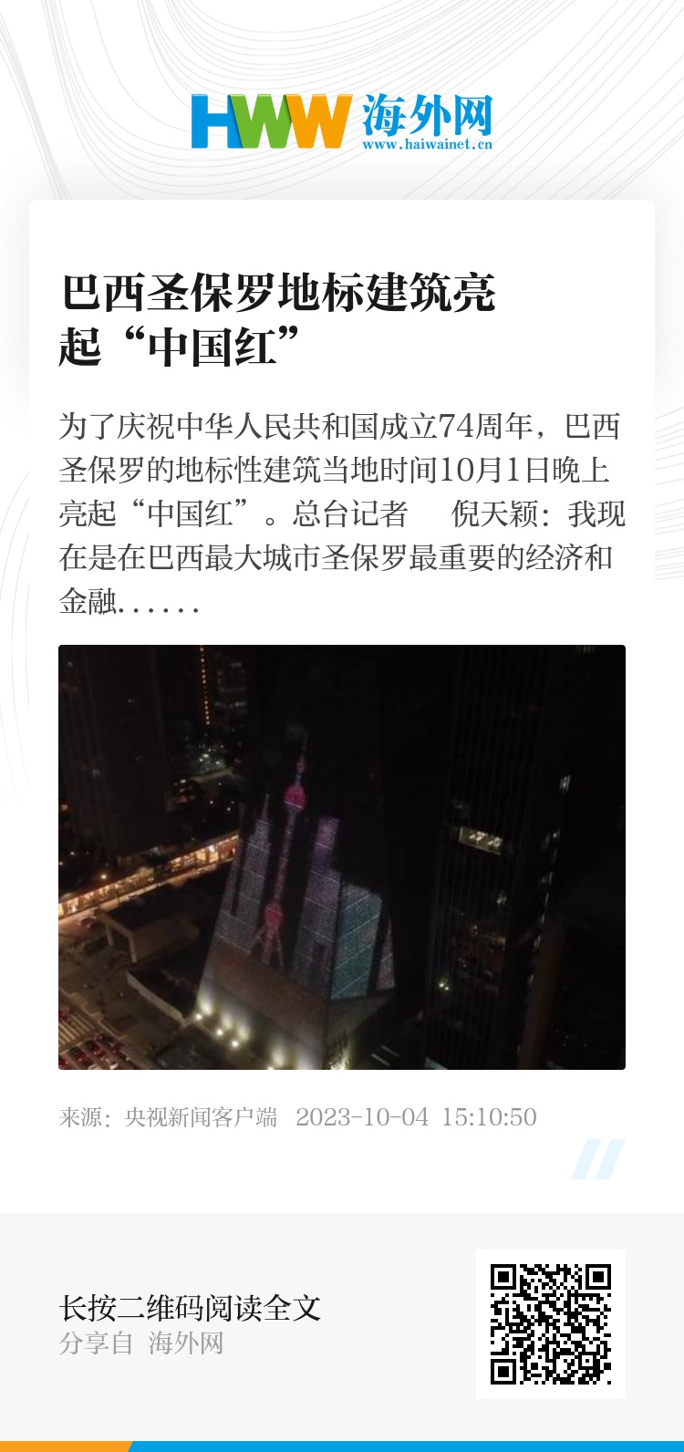 总台记者 倪天颖:我现在是在巴西最大城市圣保罗最重要的经济和金融中枢保利斯塔大街上。为了庆祝中华人民共和国成立74周年,在我身后的地标性建筑上,正在上演中国国旗灯光秀。