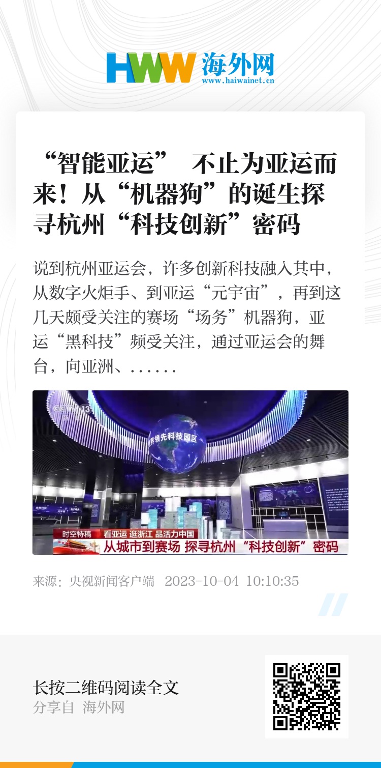 说到杭州亚运会,许多创新科技融入其中,从数字火炬手、到亚运“元宇宙”,再到这几天颇受关注的赛场“场务”机器狗,亚运“黑科技”频受关注,通过亚运会的舞台,向亚洲、向世界逐一展现。科技创新,从城市走向赛场,是什么让杭州有这样的底气?