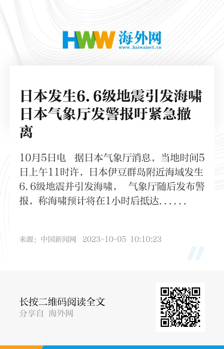 中新网10月5日电 据日本气象厅消息,当地时间5日上午11时许,日本伊豆群岛附近海域发生6.6级地震并引发海啸, 气象厅随后发布警报,称海啸预计将在1小时后抵达当地海岸。