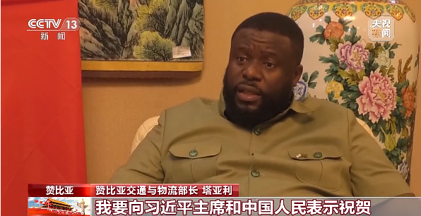 赞比亚交通与物流部长 塔亚利:我要向习近平主席和中国人民表示祝贺,热烈祝贺中华人民共和国成立74周年,祝愿中国今后能够不断发展。