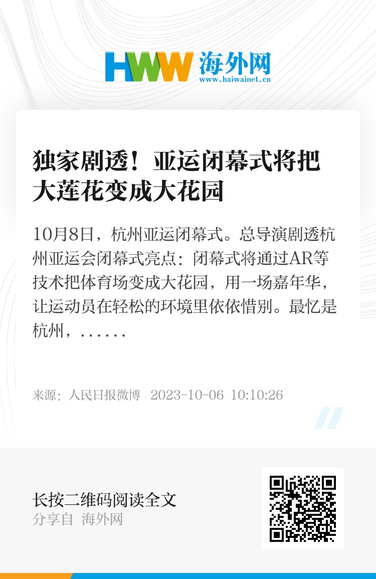 10月8日,杭州亚运闭幕式。总导演剧透杭州亚运会闭幕式亮点:闭幕式将通过AR等技术把体育场变成大花园,用一场嘉年华,让运动员在轻松的环境里依依惜别。最忆是杭州,共同期待!