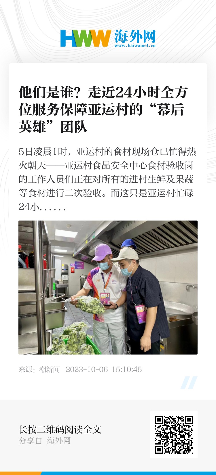 在这个参赛人员的大本营,“村民”们食材安全保障是关注度最高的问题之一。“浙江省市场监管系统从全省7个地区抽调108名精兵强将进驻亚运村,确保‘村民’在赛时吃得舒心放心。”亚运村食品安全中心副主任胡文敏说,从9月16日开始,“108将”就进入“连轴转”状态,主要负责食材验收、拆包、留样、清洗等工作。