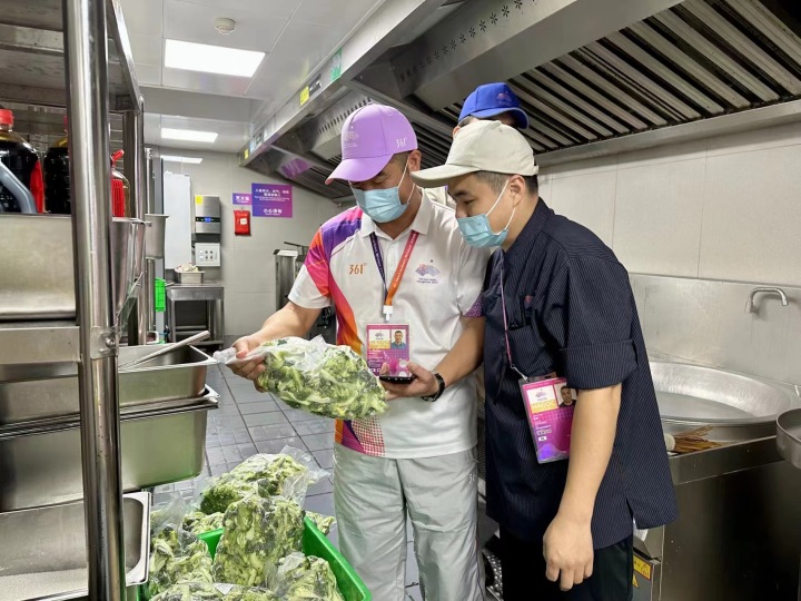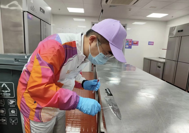 当然,这些能进入食品加工专间的食物,本身已闯过层层关卡。食材验收岗的陆志杰每天都要工作12小时,“白+黑”是工作常态。“虽然食材前期就会进行检测验收,但亚运村的食安工作必须要确保万无一失。”陆志杰笑着说,自己已在这个岗位上练出了“火眼金睛”,哪怕是细小的问题,也要第一时间发现。