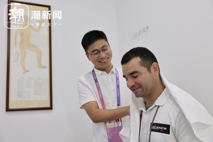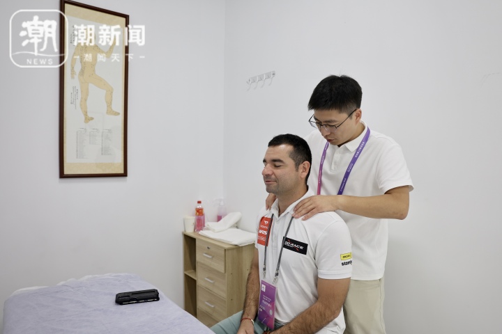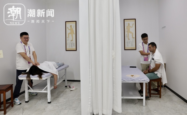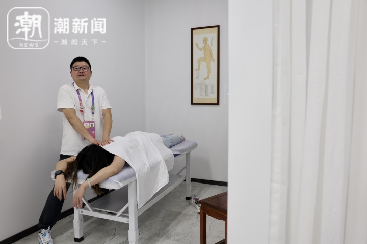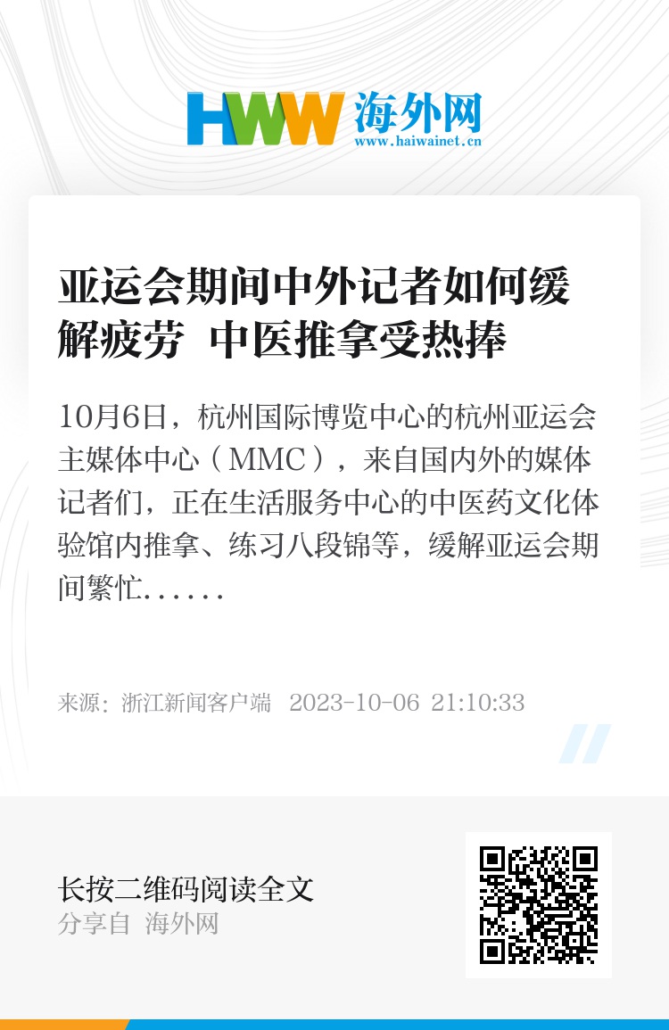 10月6日,杭州国际博览中心的杭州亚运会主媒体中心(MMC),来自国内外的媒体记者们,正在生活服务中心的中医药文化体验馆内推拿、练习八段锦等,缓解亚运会期间繁忙工作带来的疲惫感。据统计,亚运会期间,中医药文化体验馆已累计接待5000多人次,为500多位中外记者进行推拿等服务。