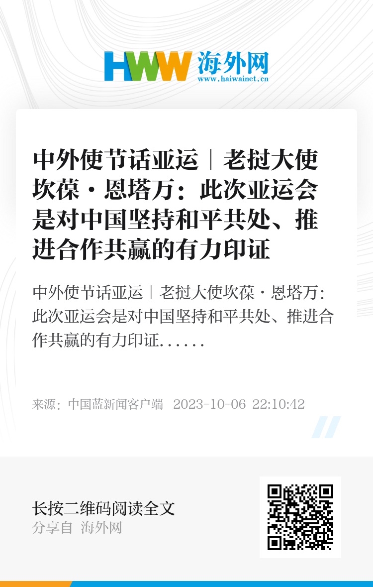 中外使节话亚运|老挝大使坎葆·恩塔万:此次亚运会是对中国坚持和平共处、推进合作共赢的有力印证