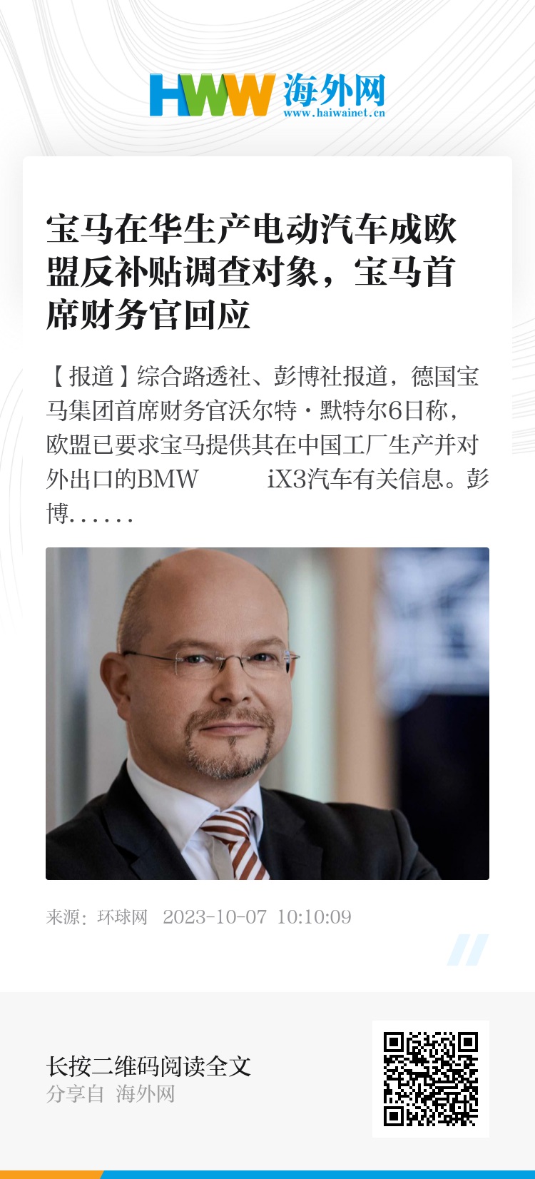 【环球网报道】综合路透社、彭博社报道,德国宝马集团首席财务官沃尔特·默特尔6日称,欧盟已要求宝马提供其在中国工厂生产并对外出口的BMW iX3汽车有关信息。彭博社称,这是欧盟对进口自中国的电动汽车所发起反补贴调查的一部分。路透社报道称,默特尔认为,欧盟发起此项调查可能弊大于利。