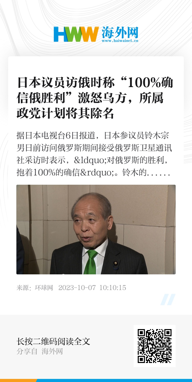 此外,据日本电视台报道,铃木宗男所属政党日本维新会表示,铃木的有关言论“与党的方针相悖”,将在下周正式决定对他的处分。《朝日新闻》称,该党计划将铃木宗男除名。