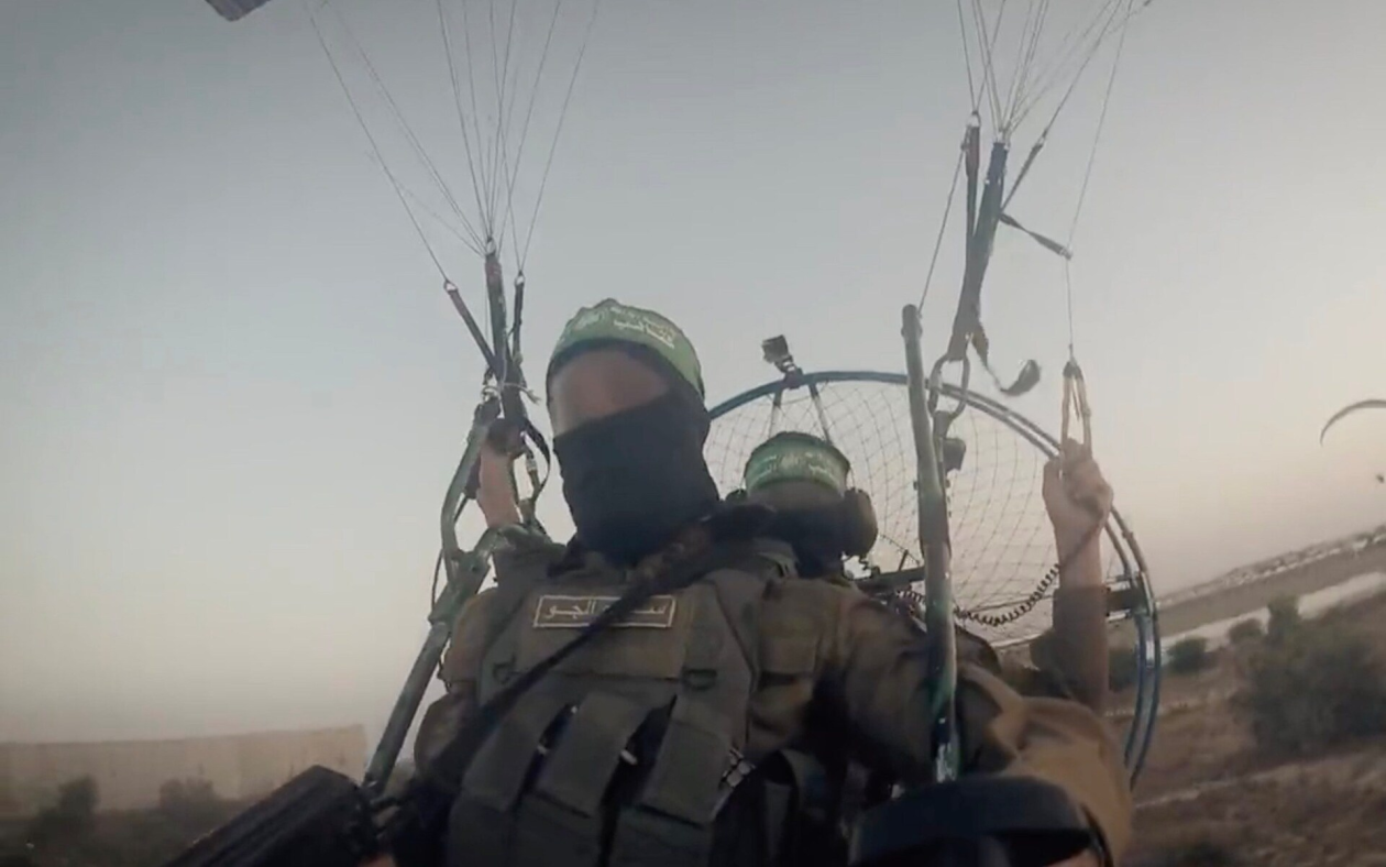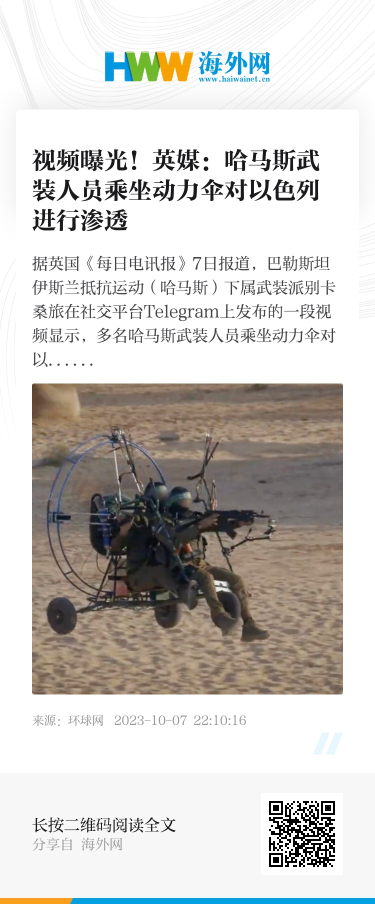 据英国《每日电讯报》7日报道,巴勒斯坦伊斯兰抵抗运动(哈马斯)下属武装派别卡桑旅在社交平台Telegram上发布的一段视频显示,多名哈马斯武装人员乘坐动力伞对以色列定居点进行渗透。画面显示,哈马斯武装人员携带武器,在抵达目的地后发起攻击。