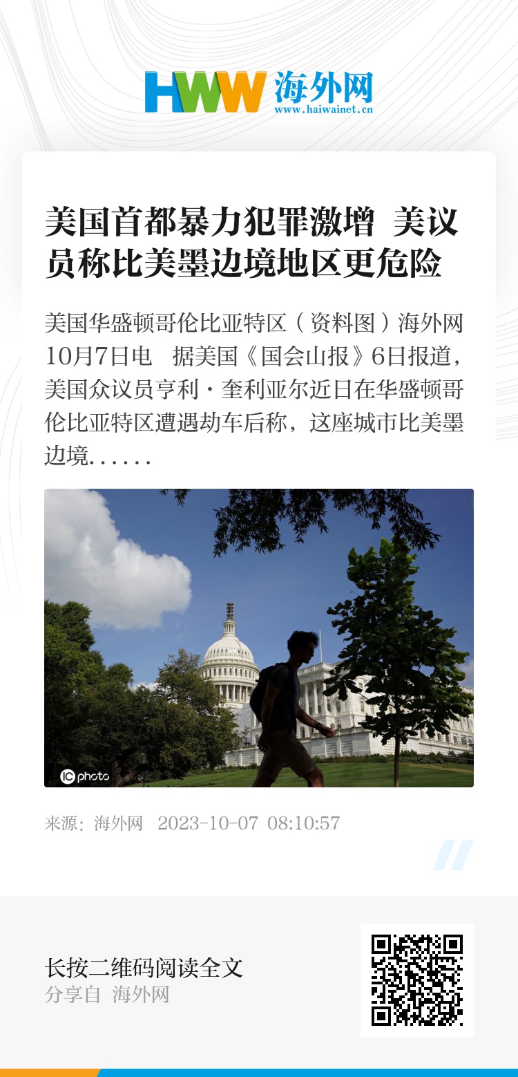 海外网10月7日电 据美国《国会山报》6日报道,美国众议员亨利·奎利亚尔近日在华盛顿哥伦比亚特区遭遇劫车后称,这座城市比美墨边境地区“更危险”。