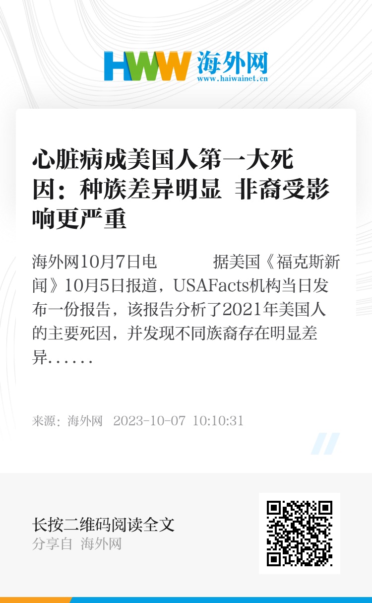 海外网10月7日电 据美国《福克斯新闻》10月5日报道,USAFacts机构当日发布一份报告,该报告分析了2021年美国人的主要死因,并发现不同族裔存在明显差异。