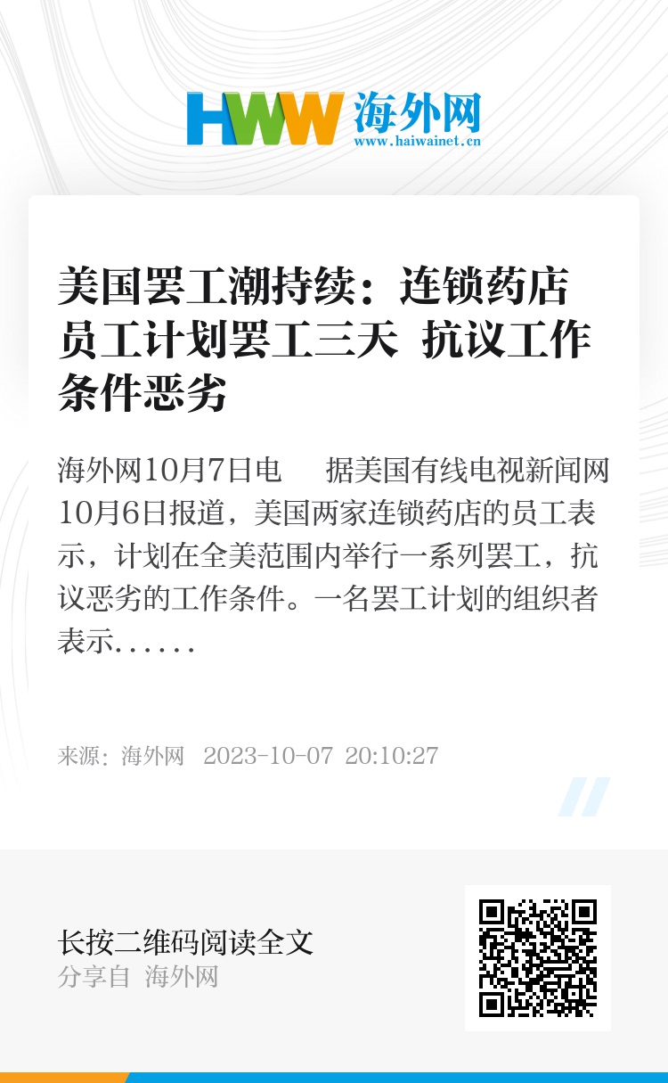 海外网10月7日电 据美国有线电视新闻网10月6日报道,美国两家连锁药店的员工表示,计划在全美范围内举行一系列罢工,抗议恶劣的工作条件。
