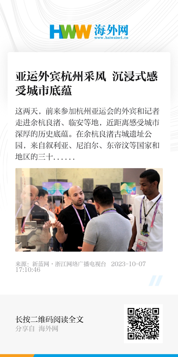 这两天,前来参加杭州亚运会的外宾和记者走进余杭良渚、临安等地,近距离感受城市深厚的历史底蕴。在余杭良渚古城遗址公园,来自叙利亚、尼泊尔、东帝汶等国家和地区的三十多名亚奥理事会大家庭的嘉宾登上大莫角山,走进反山王陵遗址,他们在良渚博物院,详细了解五千多年前良渚先民的建城水平和制玉技艺,大家对延绵不绝、生生不息的中华文明表示惊叹。