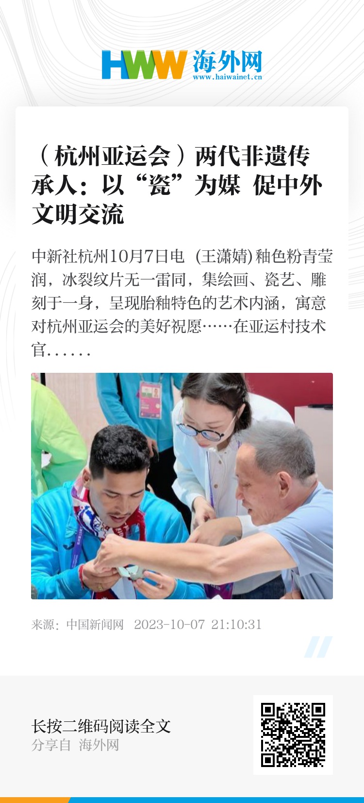 文明的交流,活动是最好的载体。素坯彩绘、碎瓷拼贴、瓷器修复……杭州亚运会期间,来自八方的中外友人,通过观展和沉浸式体验,亲手制作各具特色的瓷艺作品,“零距离”感受中华文化的博大精深和诗画浙江的人文底蕴。