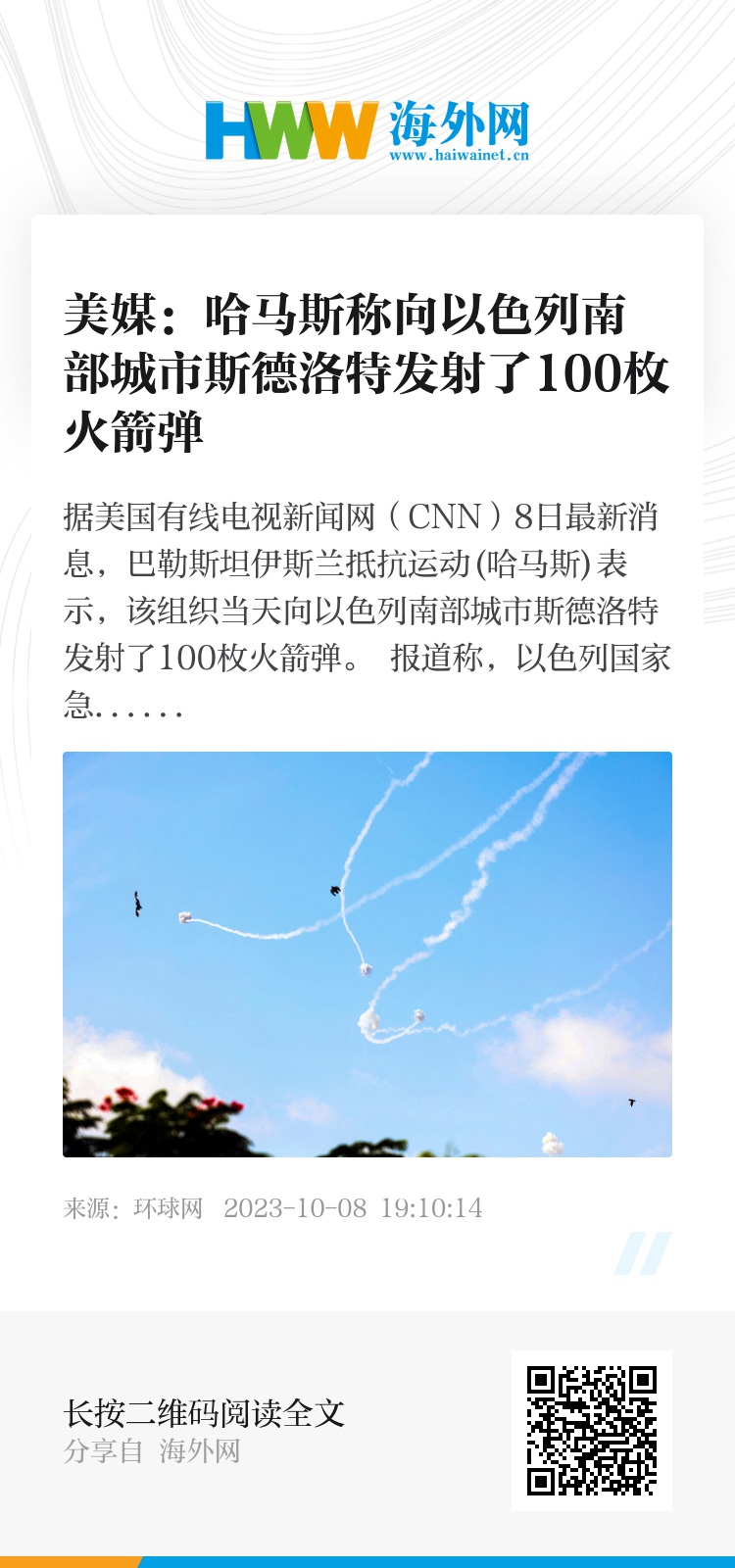 据美国有线电视新闻网(CNN)8日最新消息,巴勒斯坦伊斯兰抵抗运动(哈马斯)表示,该组织当天向以色列南部城市斯德洛特发射了100枚火箭弹。