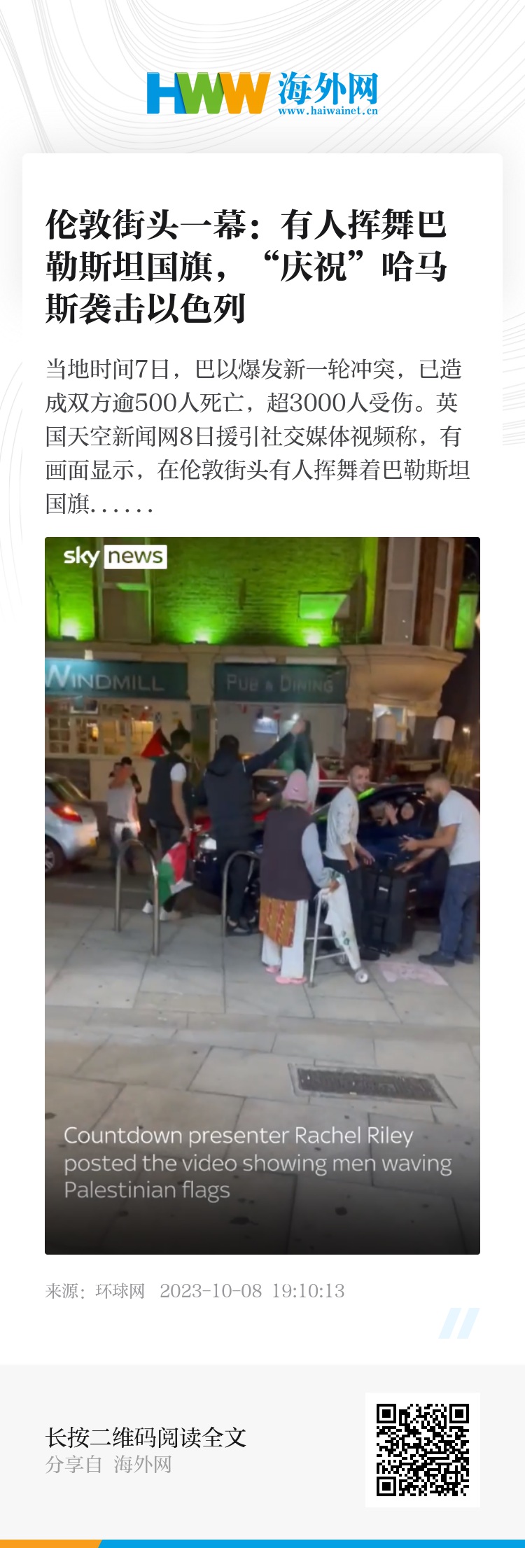 当地时间7日,巴以爆发新一轮冲突,已造成双方逾500人死亡,超3000人受伤。英国天空新闻网8日援引社交媒体视频称,有画面显示,在伦敦街头有人挥舞着巴勒斯坦国旗并跳舞,似乎是在“庆祝”巴勒斯坦伊斯兰抵抗运动(哈马斯)对以色列的打击行动。