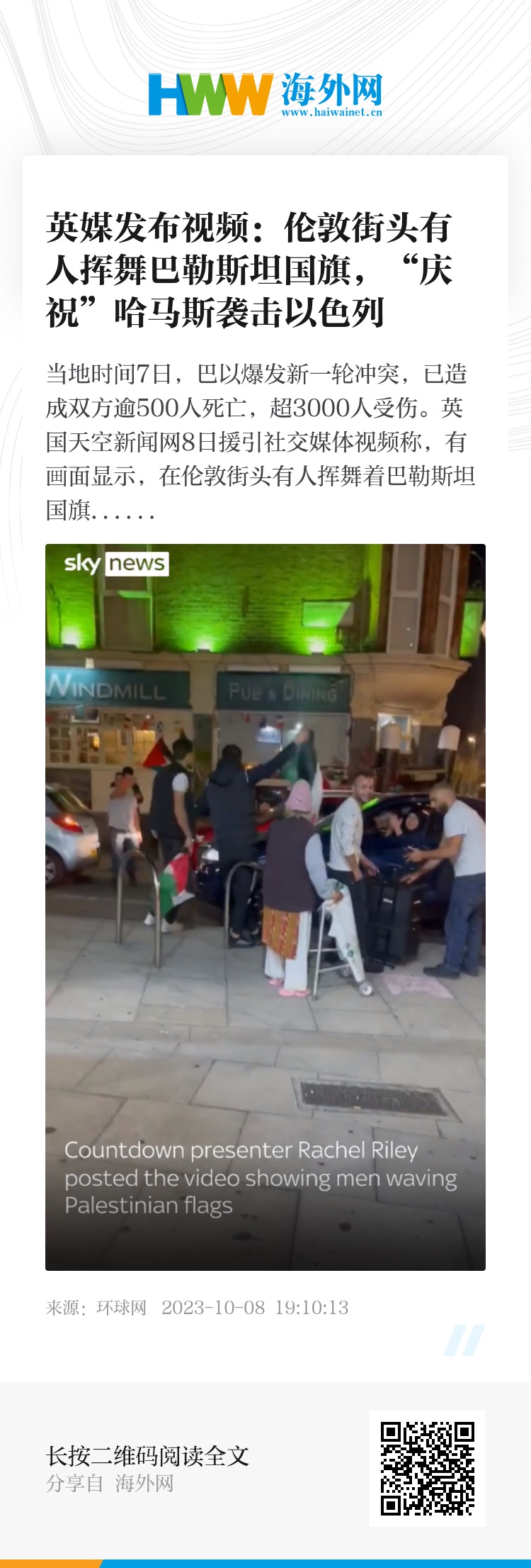 当地时间7日,巴以爆发新一轮冲突,已造成双方逾500人死亡,超3000人受伤。英国天空新闻网8日援引社交媒体视频称,有画面显示,在伦敦街头有人挥舞着巴勒斯坦国旗并跳舞,似乎是在“庆祝”巴勒斯坦伊斯兰抵抗运动(哈马斯)对以色列的打击行动。