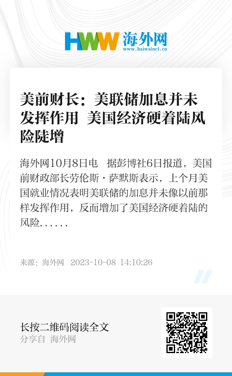 海外网10月8日电 据彭博社6日报道,美国前财政部长劳伦斯·萨默斯表示,上个月美国就业情况表明美联储的加息并未像以前那样发挥作用,反而增加了美国经济硬着陆的风险。