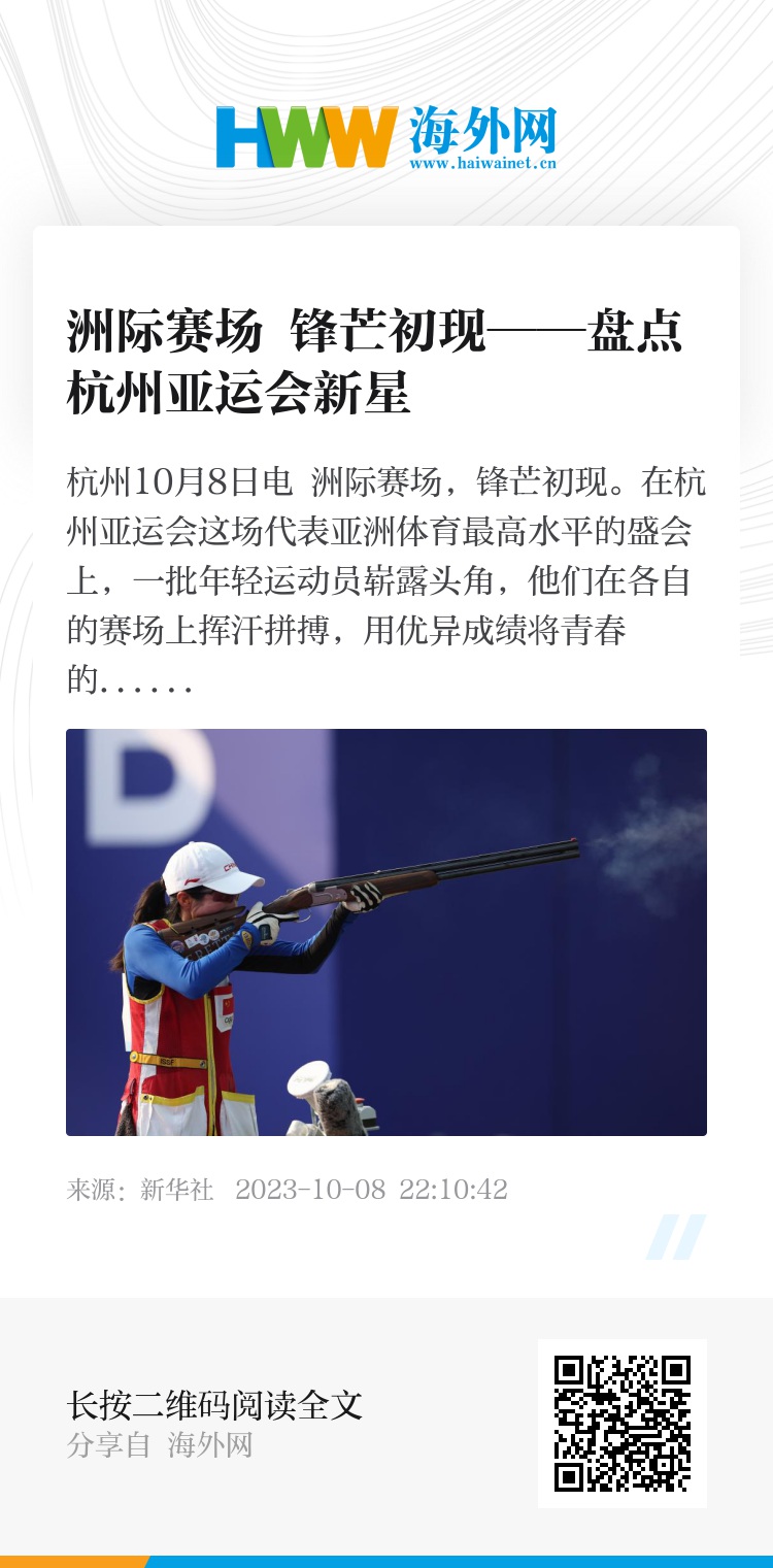 新华社杭州10月8日电 洲际赛场,锋芒初现。在杭州亚运会这场代表亚洲体育最高水平的盛会上,一批年轻运动员崭露头角,他们在各自的赛场上挥汗拼搏,用优异成绩将青春的高光写入亚运历史。