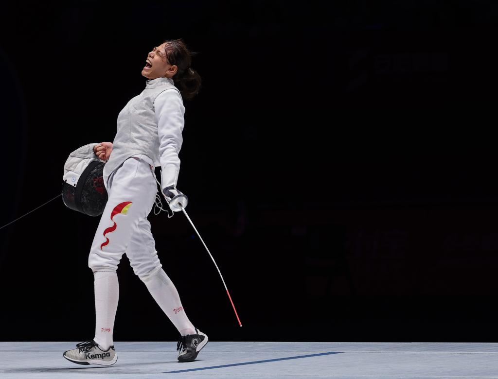 9月28日,中国选手黄芊芊在决赛后庆祝胜利。新华社记者 徐昱 摄