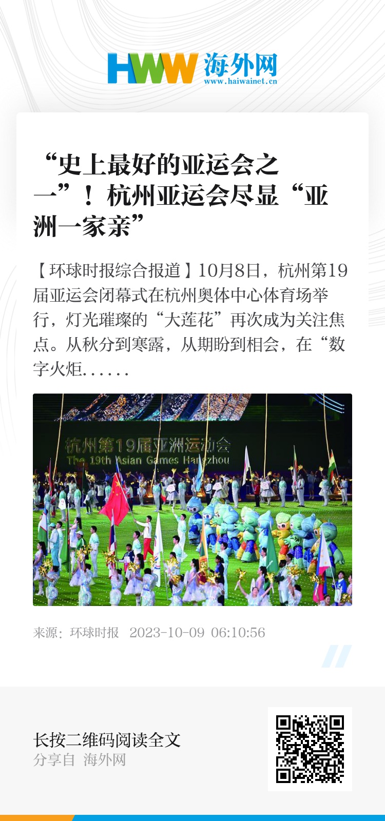 【环球时报综合报道】10月8日,杭州第19届亚运会闭幕式在杭州奥体中心体育场举行,灯光璀璨的“大莲花”再次成为关注焦点。从秋分到寒露,从期盼到相会,在“数字火炬人”的引领下,本届亚运会主火炬缓缓熄灭。中国国务院总理李强、亚奥理事会代理主席辛格出席闭幕式。经过16个正式比赛日的激烈角逐,中国军团最终以201金111银71铜的成绩,再次位列金牌榜、奖牌榜双榜首。中国代表团也成为亚运历史上首个金牌总数达到200枚的代表团。本届亚运会举办超过5000场比赛,决出481枚金牌,截至7日晚,共刷新15次世界纪录,37次亚洲纪录,170次赛会纪录。在45个参赛代表团中,有27个代表团获得金牌,41个代表团获得奖牌,获得奖牌代表团数量为历届亚运会之最。在“绿色、智能、节俭、文明”的办赛理念下,首次举办国际综合性运动会的杭州,不仅用自己的开放、包容、热情为全亚洲运动员搭建起梦想舞台,也将中华文化的博大精深、文明间的交流互鉴、竞技体育的盎然魅力充分展现,为全世界奉上了一届“中国特色、亚洲风采、精彩纷呈”的体育盛会。“本届亚运会展现了中国的软实力”,黎巴嫩新闻网站Al Mayadeen报道称,在亚运会期间,中国的传统文化、丰富的体育资产以及热情好客的氛围使杭州亚运会成为真正的区域性和全球化盛会。