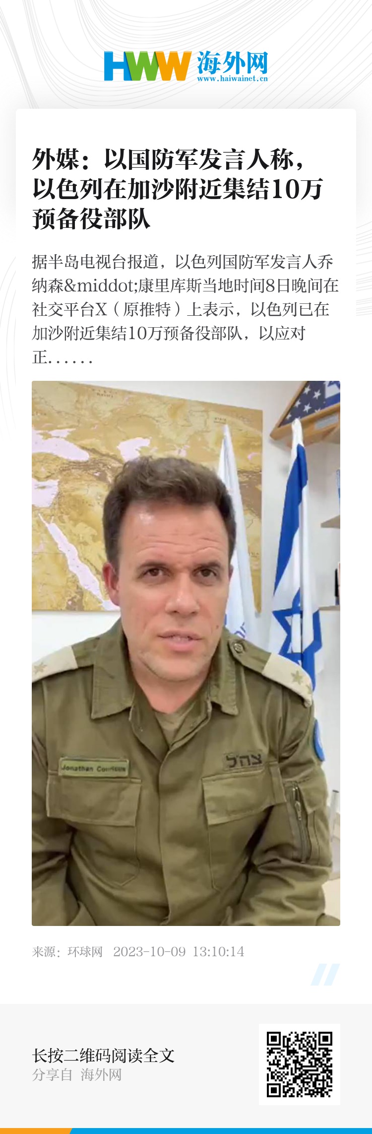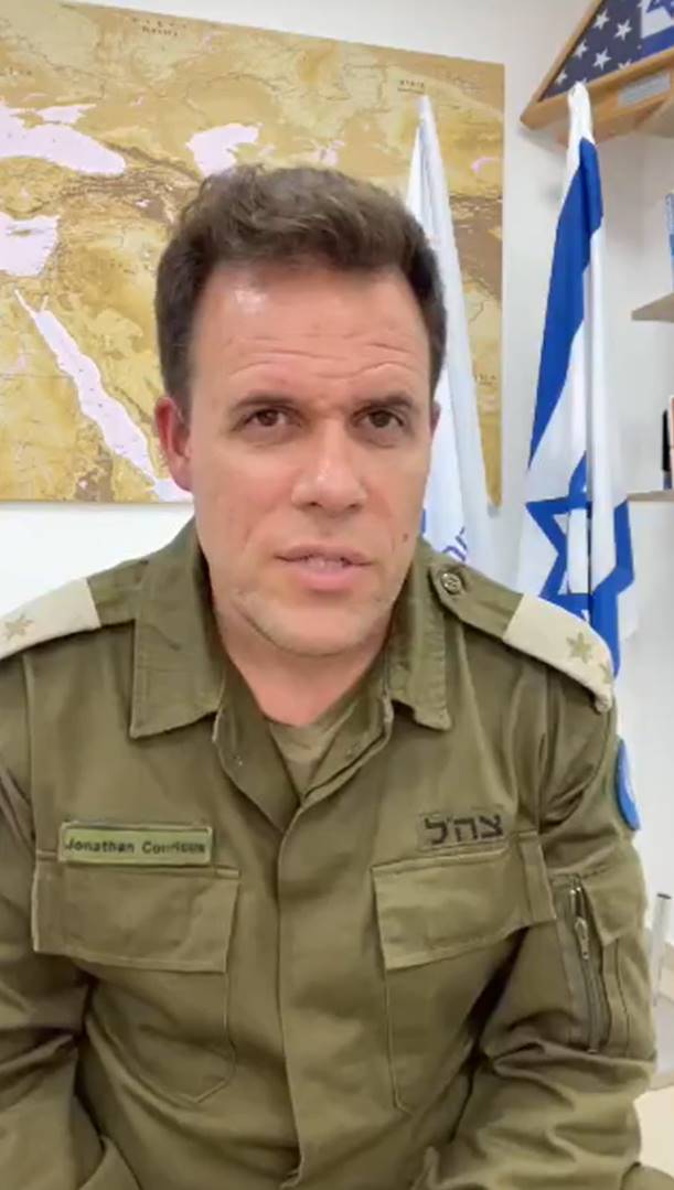 “我们目前在以色列南部集结了约有10万人的预备役部队,”乔纳森·康里库斯在社交平台X(原推特)上发布的一段视频中说。他还表示,“我们的工作是确保在这场战争结束时,哈马斯不再有任何军事能力来威胁以色列平民,”“除此之外,我们还要确保哈马斯无法‘统治’加沙地带。”