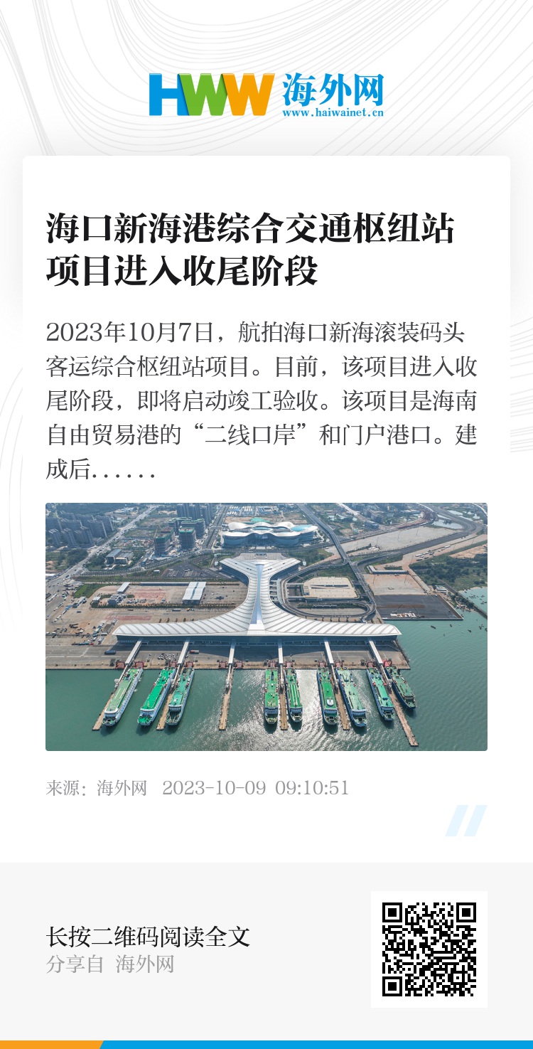 2023年10月7日,航拍海口新海滚装码头客运综合枢纽站项目。目前,该项目进入收尾阶段,即将启动竣工验收。该项目是海南自由贸易港的“二线口岸”和门户港口。建成后,将成为集港口候船、登离船、口岸查验、枢纽商业和交通“零换乘”等功能于一体的全国最大港口客滚综合枢纽,将助力新海港成为琼州海峡大通道的关键枢纽港、口岸门户、链接陆岛的关键节点。图源:视觉中国