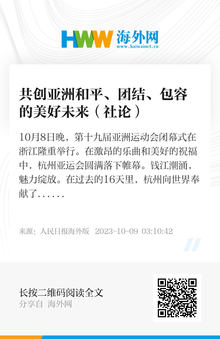 “江南忆,最忆是杭州。”杭州亚运会给全世界留下难忘的杭州记忆。让我们带着这份美好的记忆,走人间正道,干正义事业,坚定不移朝着强国建设、民族复兴的宏伟目标奋勇前进,同各国人民一道推动构建亚洲和人类命运共同体,共同建设持久和平、普遍安全、共同繁荣、开放包容、清洁美丽的世界。