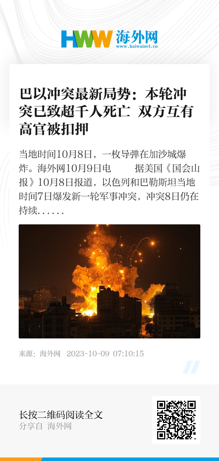 海外网10月9日电 据美国《国会山报》10月8日报道,以色列和巴勒斯坦当地时间7日爆发新一轮军事冲突,冲突8日仍在持续。截至目前,巴以此次大规模冲突已致超1000人死亡,数千人受伤。