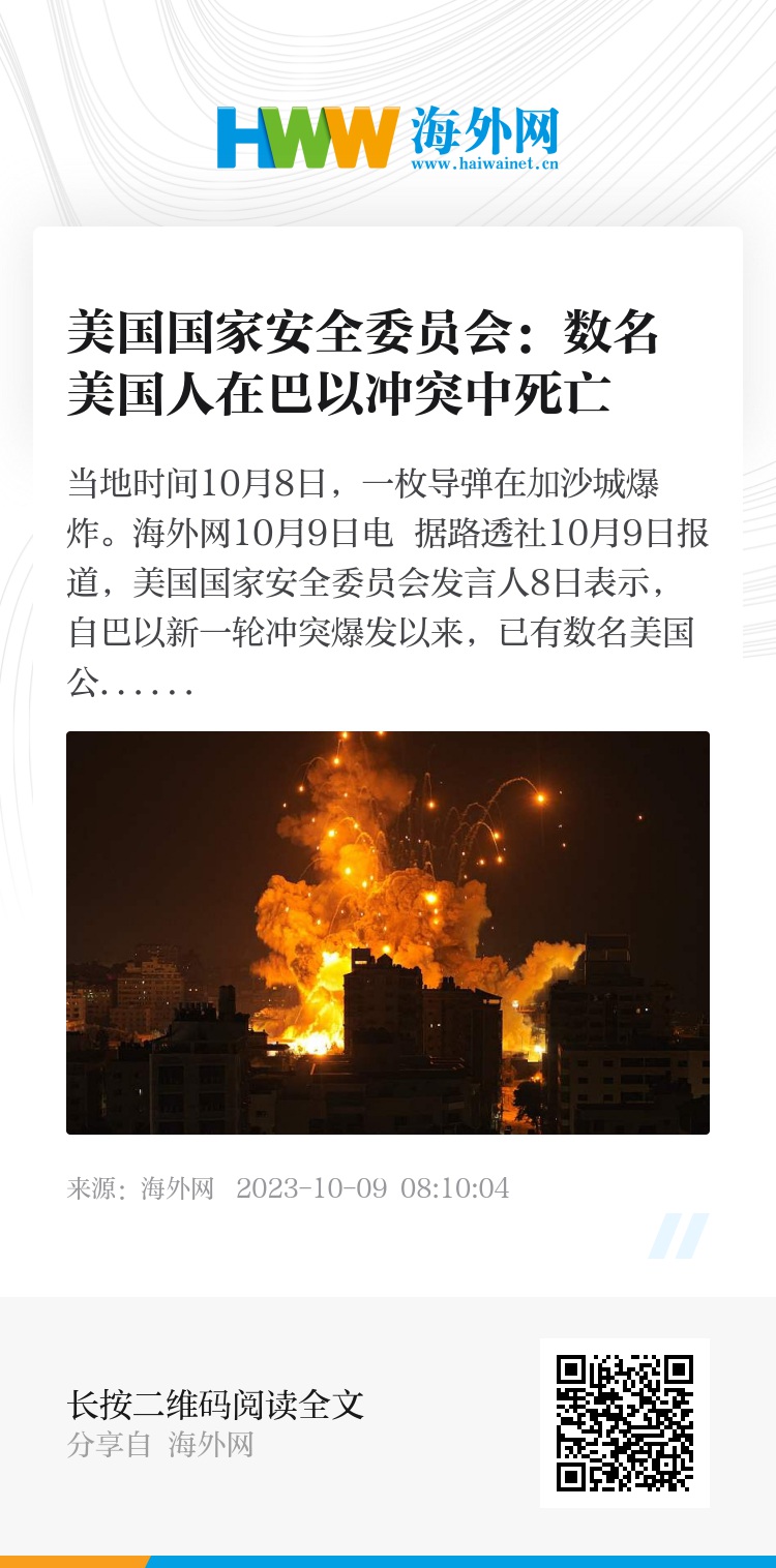 海外网10月9日电 据路透社10月9日报道,美国国家安全委员会发言人8日表示,自巴以新一轮冲突爆发以来,已有数名美国公民死亡。美国有线电视新闻网(CNN)援引一份内部备忘录称,至少有3名美国人身亡。