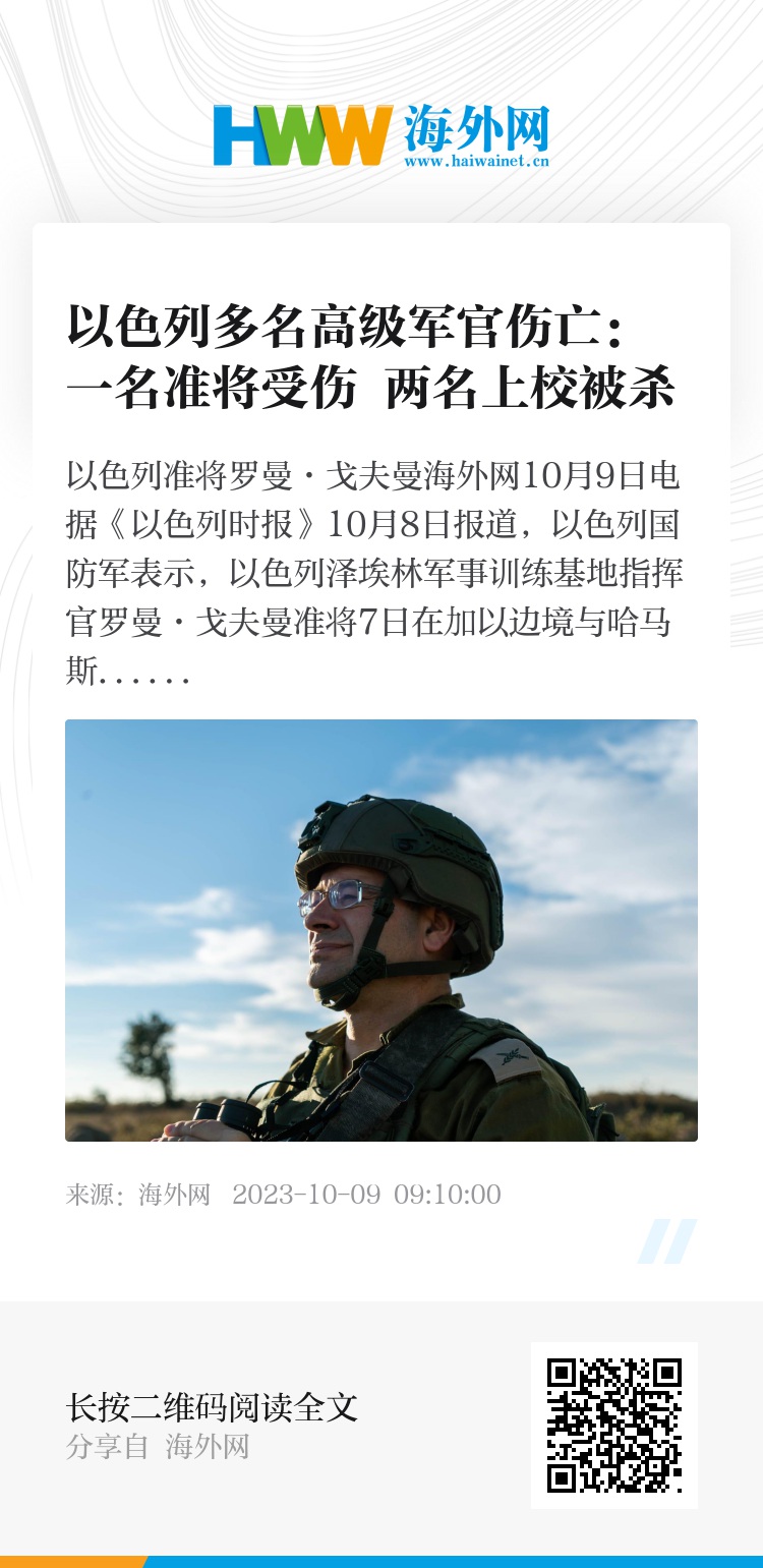 海外网10月9日电 据《以色列时报》10月8日报道,以色列国防军表示,以色列泽埃林军事训练基地指挥官罗曼·戈夫曼准将7日在加以边境与哈马斯交火中受伤,目前情况稳定。