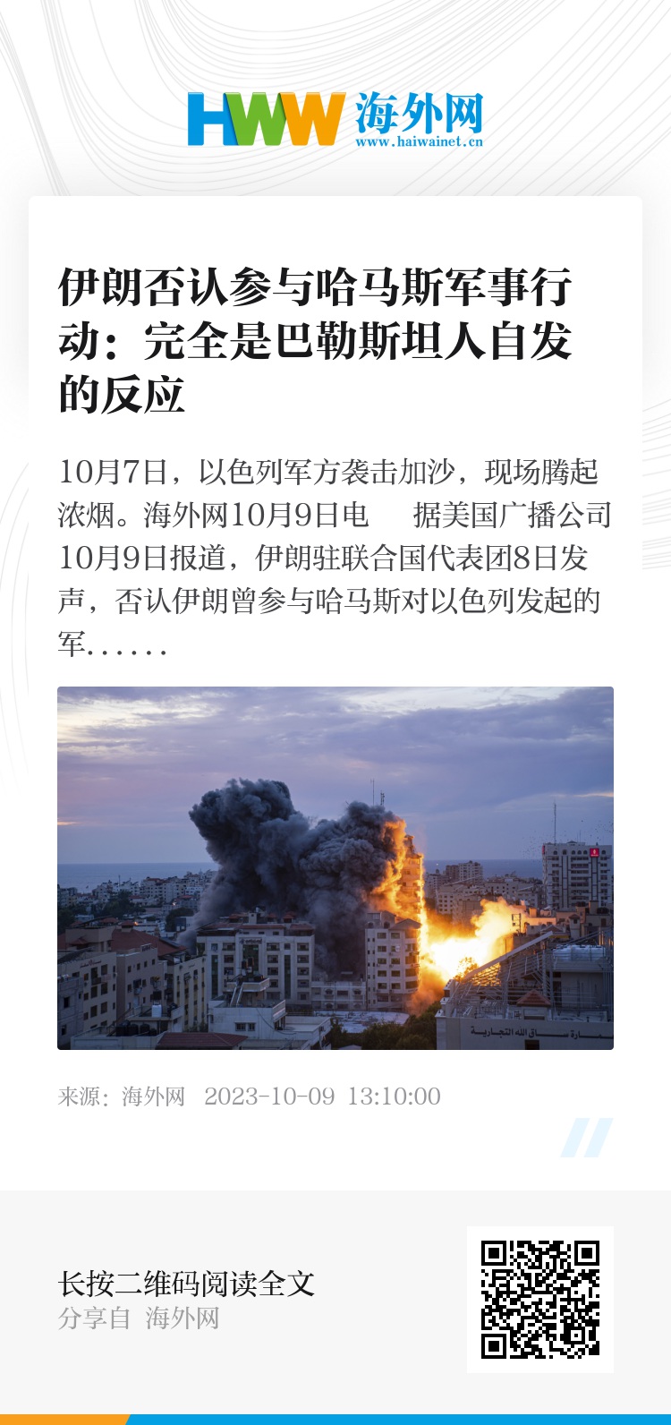 海外网10月9日电 据美国广播公司10月9日报道,伊朗驻联合国代表团8日发声,否认伊朗曾参与哈马斯对以色列发起的军事行动。