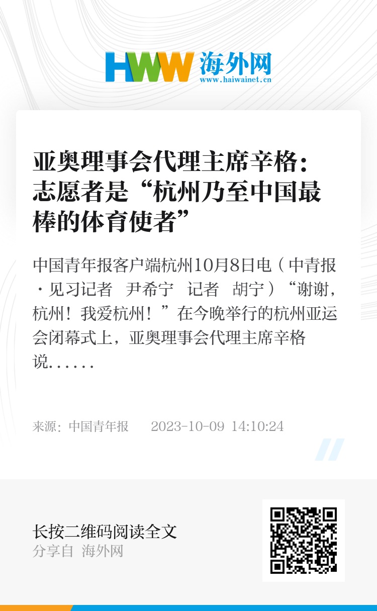 中国青年报客户端杭州10月8日电(中青报·中青网见习记者 尹希宁 记者 胡宁)“谢谢,杭州!我爱杭州!”在今晚举行的杭州亚运会闭幕式上,亚奥理事会代理主席辛格说道。