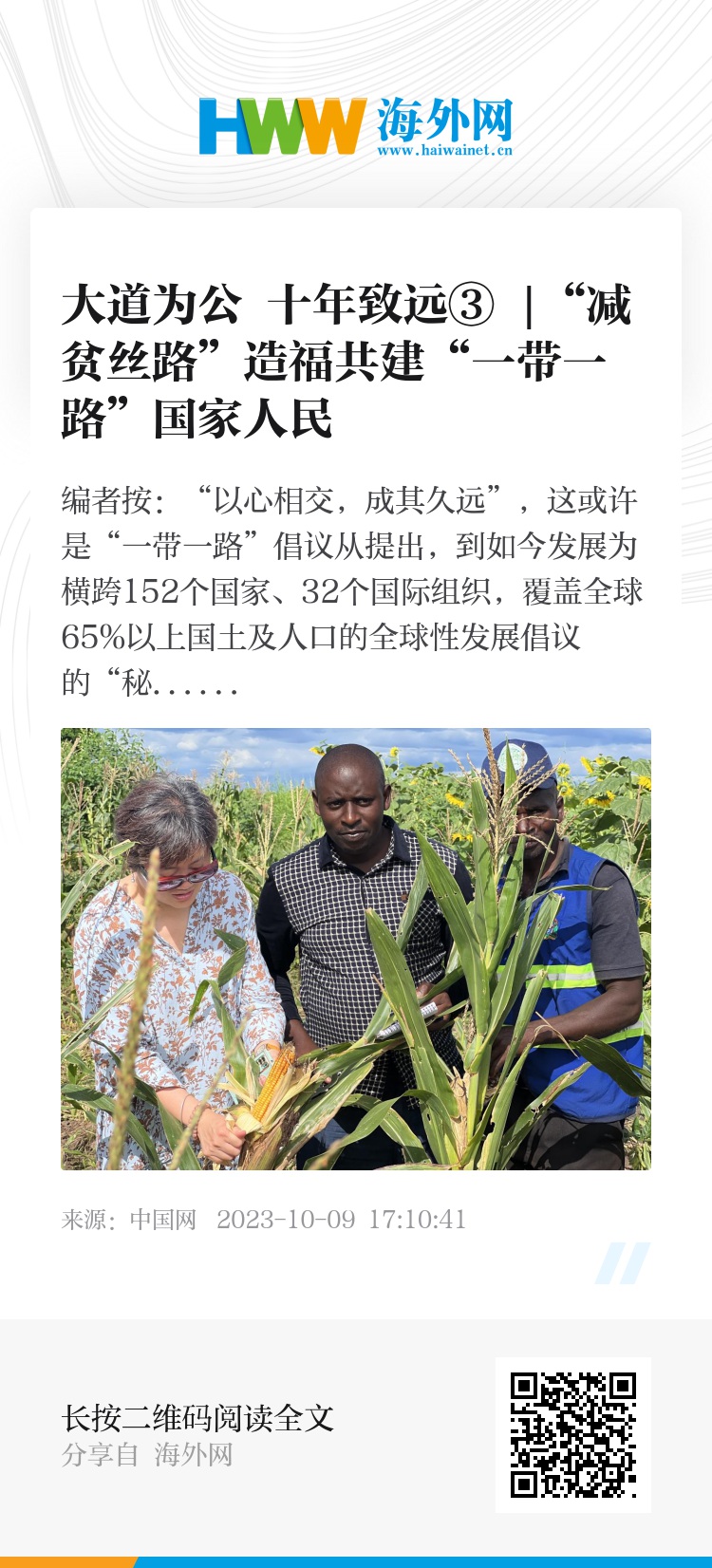 值此“一带一路”倡议提出十周年之际,中国网推出“大道为公,十年致远”系列主题报道,由“一带一路”项目参与者、亲历者,讲述共建“一带一路”过程中的感人故事,感受中国的“大国胸襟”。