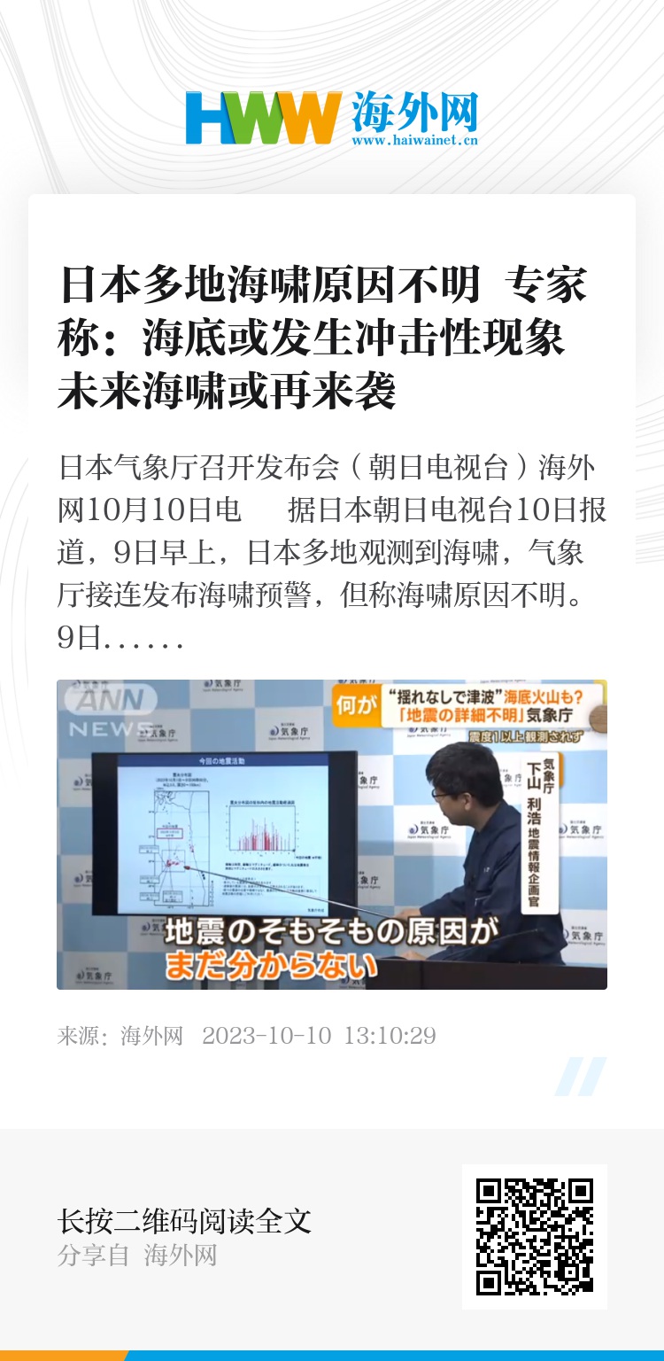 海外网10月10日电 据日本朝日电视台10日报道,9日早上,日本多地观测到海啸,气象厅接连发布海啸预警,但称海啸原因不明。