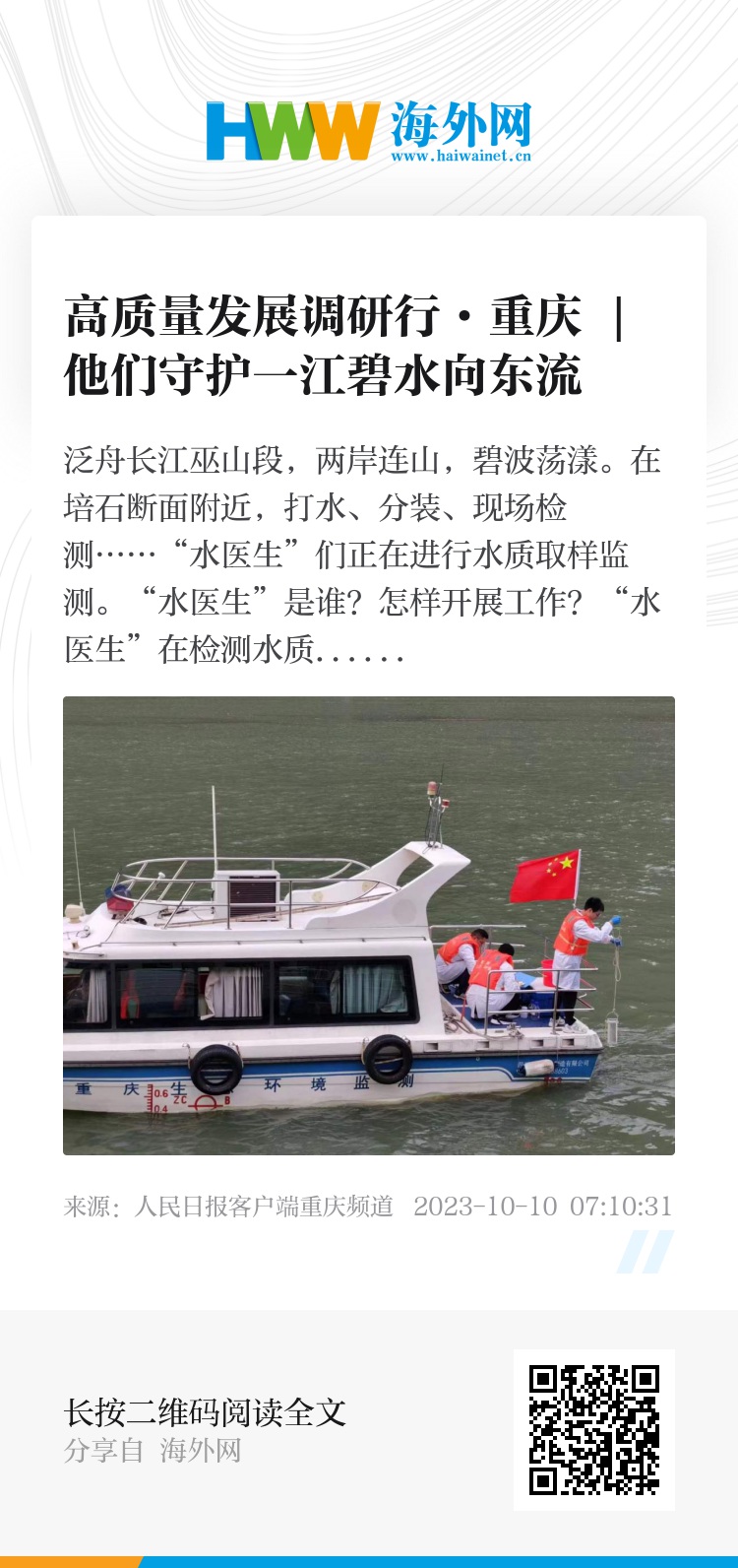 “生态环境监测工作是环境管理的‘前沿哨’。”魏嵬说,每月上旬,“水医生”都会按时对长江干流及六条支流开展水质例行监测,定期开展河流水质“体检”、入河排污口溯源工作,时刻关注水质变化情况,为环境管理决策提供数据支撑。