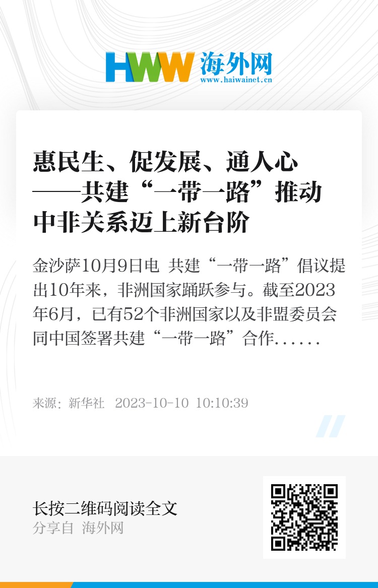 新华社金沙萨10月9日电 共建“一带一路”倡议提出10年来,非洲国家踊跃参与。截至2023年6月,已有52个非洲国家以及非盟委员会同中国签署共建“一带一路”合作文件,非洲成为参与“一带一路”倡议最重要的大陆之一。中非共建“一带一路”,惠民生、促发展、通人心,推动中非关系不断迈上新台阶。