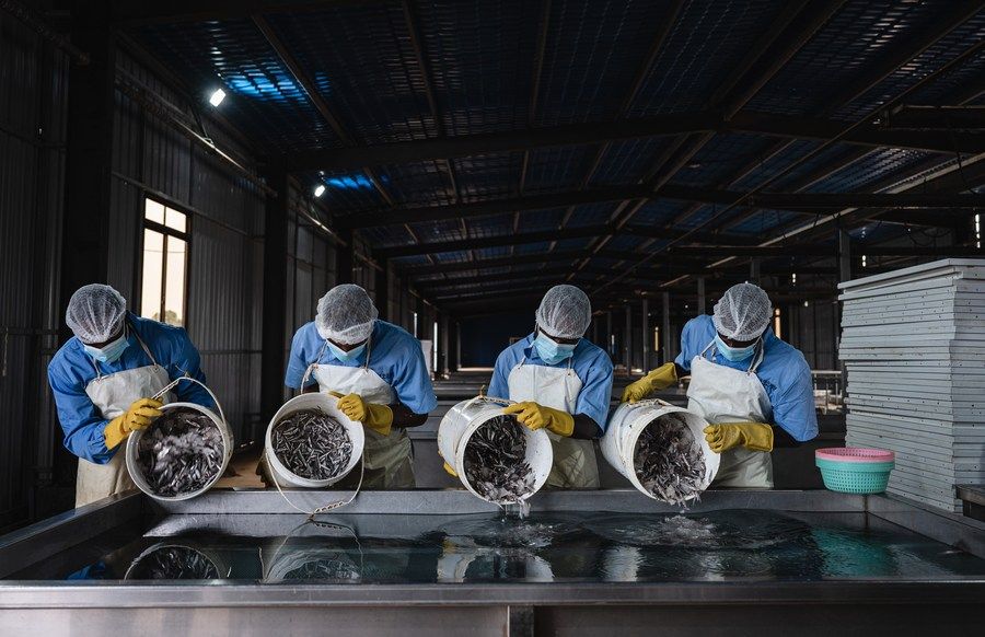 肯尼亚东部沿海地区夸莱郡希莫尼镇的水产品初加工厂里,当地员工正在熟练地处理渔民刚刚捕获的新鲜鳀鱼。经过清洗、整理、煮制、晾晒后,处理过的鱼干被送入冷库,等待漂洋过海出口到中国。