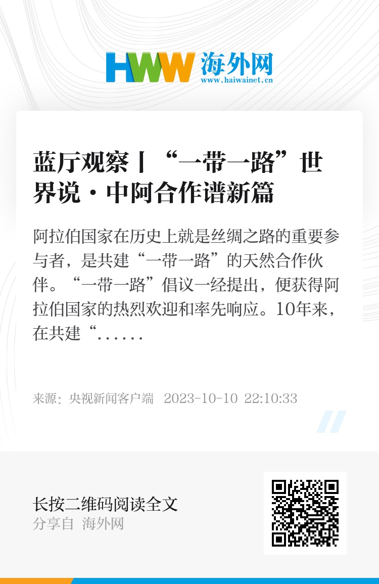十年来,中国已同20多个阿拉伯国家以及阿盟签署了共建“一带一路”合作文件,实施200多个大型合作项目,成果惠及双方近20亿人民。中阿经贸合作向通信、核能、航天卫星等新兴领域不断延伸,绿色发展、文化教育、卫生健康等领域的合作也不断实现新发展。多名阿拉伯官员认为,中阿加强“一带一路”建设合作,也将为世界带来新的发展模式和更多文明成果。