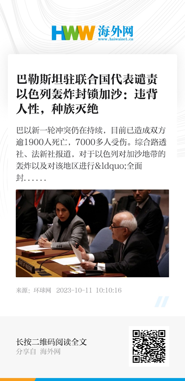 巴以新一轮冲突仍在持续,目前已造成双方逾1900人死亡,7000多人受伤。综合路透社、法新社报道,对于以色列对加沙地带的轰炸以及对该地区进行“全面封锁”的做法,巴勒斯坦驻联合国代表里亚德·曼苏尔周二(10日)予以谴责,称这“无异于种族灭绝”。