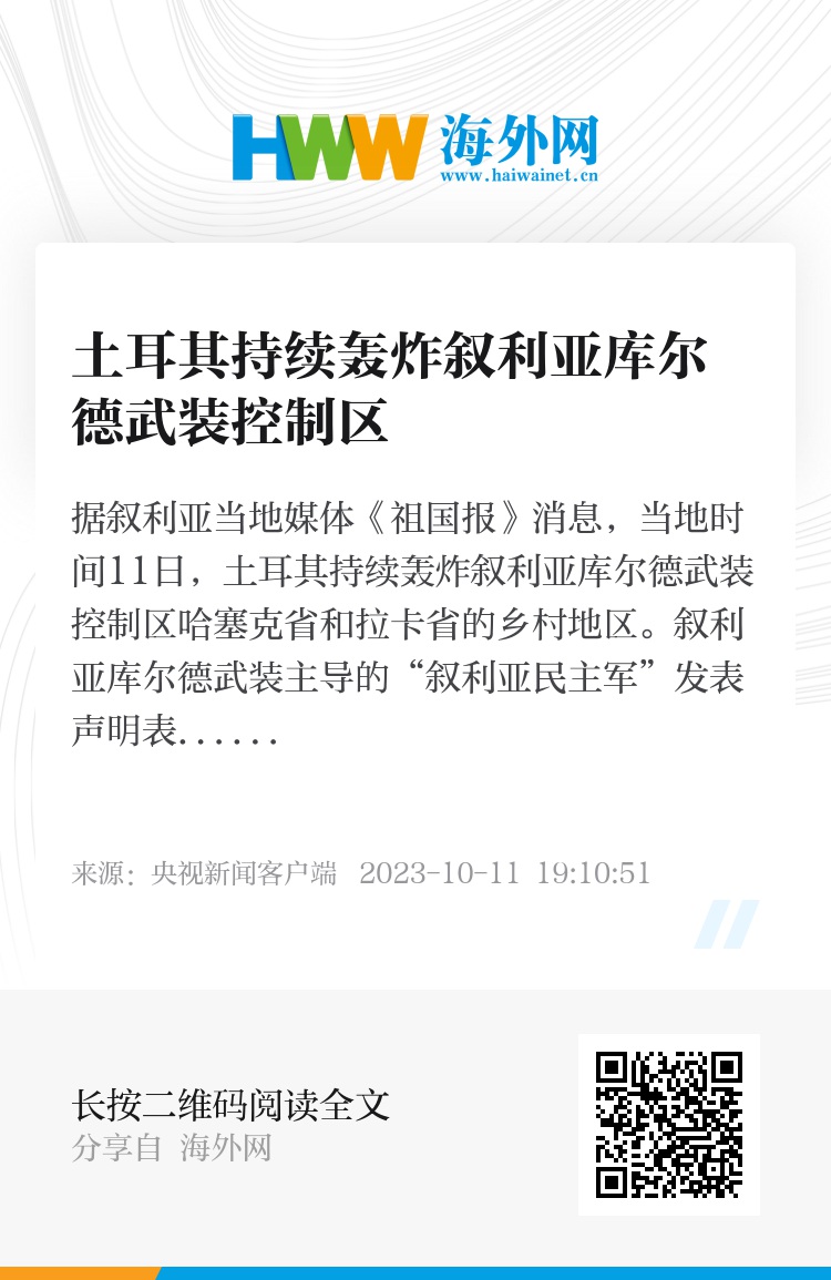 据叙利亚当地媒体《祖国报》消息,当地时间11日,土耳其持续轰炸叙利亚库尔德武装控制区哈塞克省和拉卡省的乡村地区。