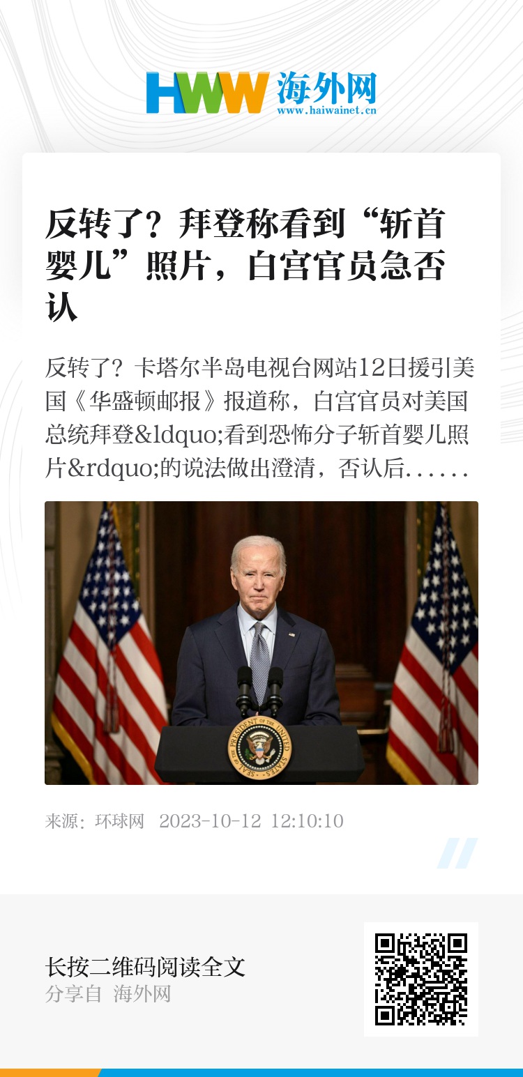 反转了?卡塔尔半岛电视台网站12日援引美国《华盛顿邮报》报道称,白宫官员对美国总统拜登“看到恐怖分子斩首婴儿照片”的说法做出澄清,否认后者或美国政府看到过有关照片。