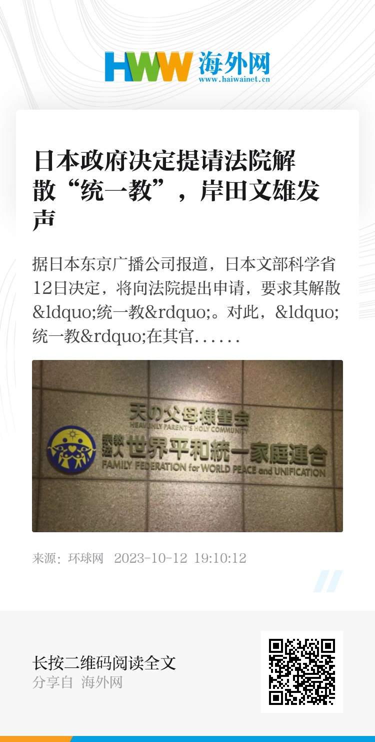 另一方面,据富士新闻网报道,针对提请法院解散“统一教”,日本首相岸田文雄12日回应称,“是在基于宗教法人法推进程序、基于客观事实做出的判断”。被问及自民党是否已经与“统一教”完全切割关系,岸田回应称,“自民党已经明确了不与有关团体有任何牵连的方针……今后将为贯彻该方针继续做出努力”。