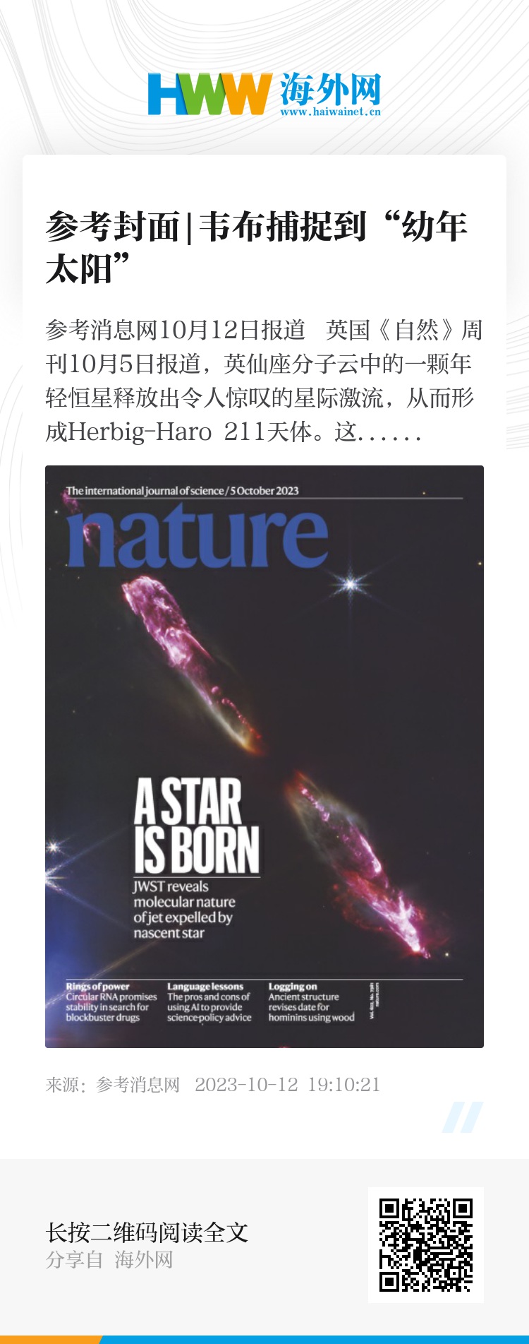 参考消息网10月12日报道 英国《自然》周刊10月5日报道,英仙座分子云中的一颗年轻恒星释放出令人惊叹的星际激流,从而形成Herbig-Haro 211天体。这是美国詹姆斯·韦布空间望远镜捕捉到的。